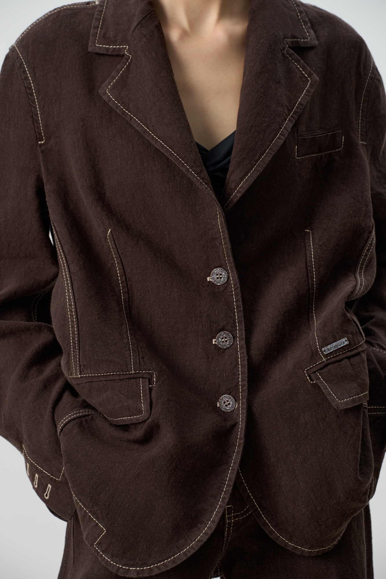 Classic single-breasted jacket made of 100% linen. The model has a straight fit, wide lapels and a three-button closure. Chest and two welt pockets with flaps. The product is decorated with stitching in a contrasting color.