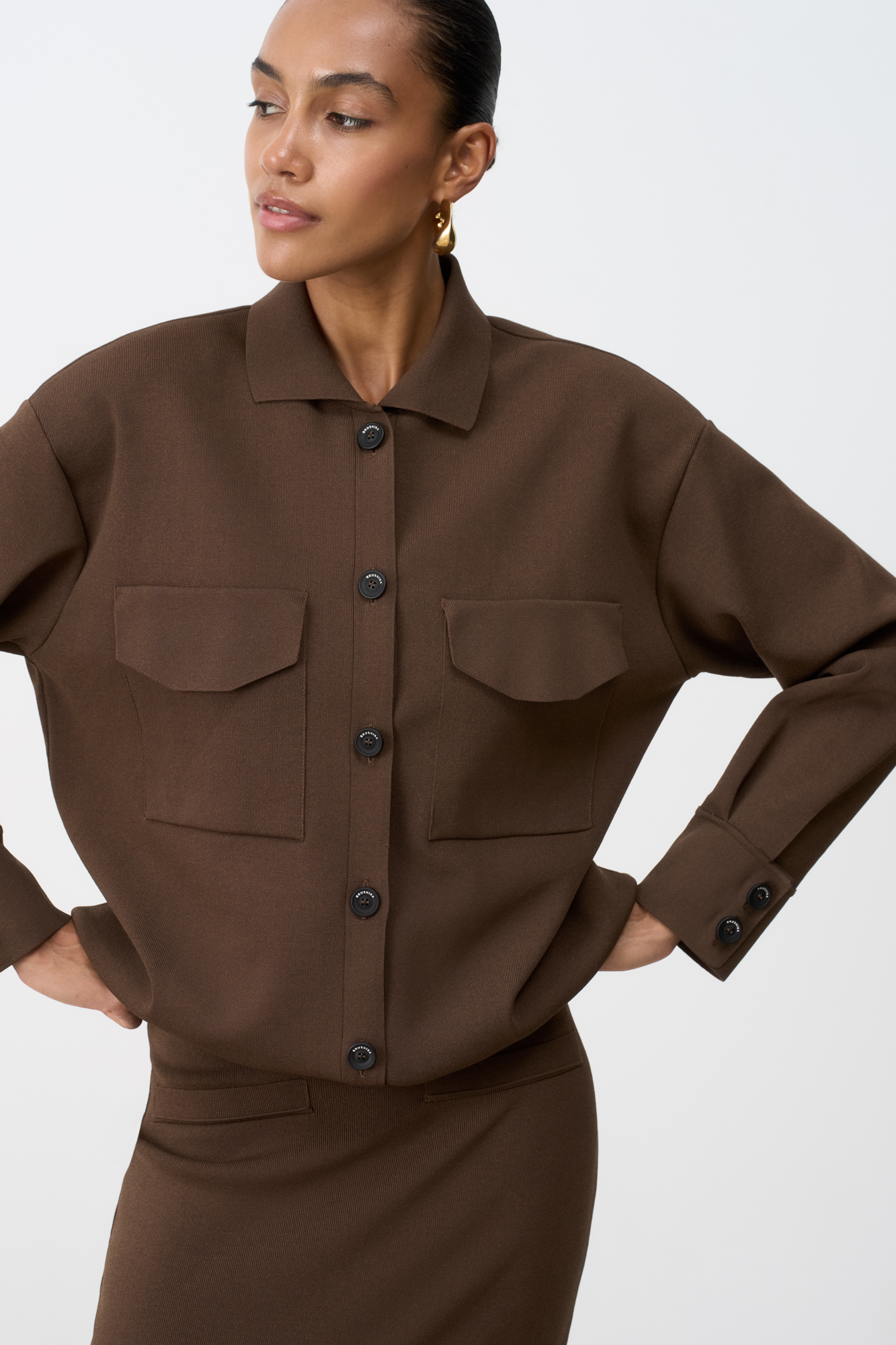 Classic knitted viscose jacket with buttons and patch pockets on the chest. Pairs with a skirt or trousers