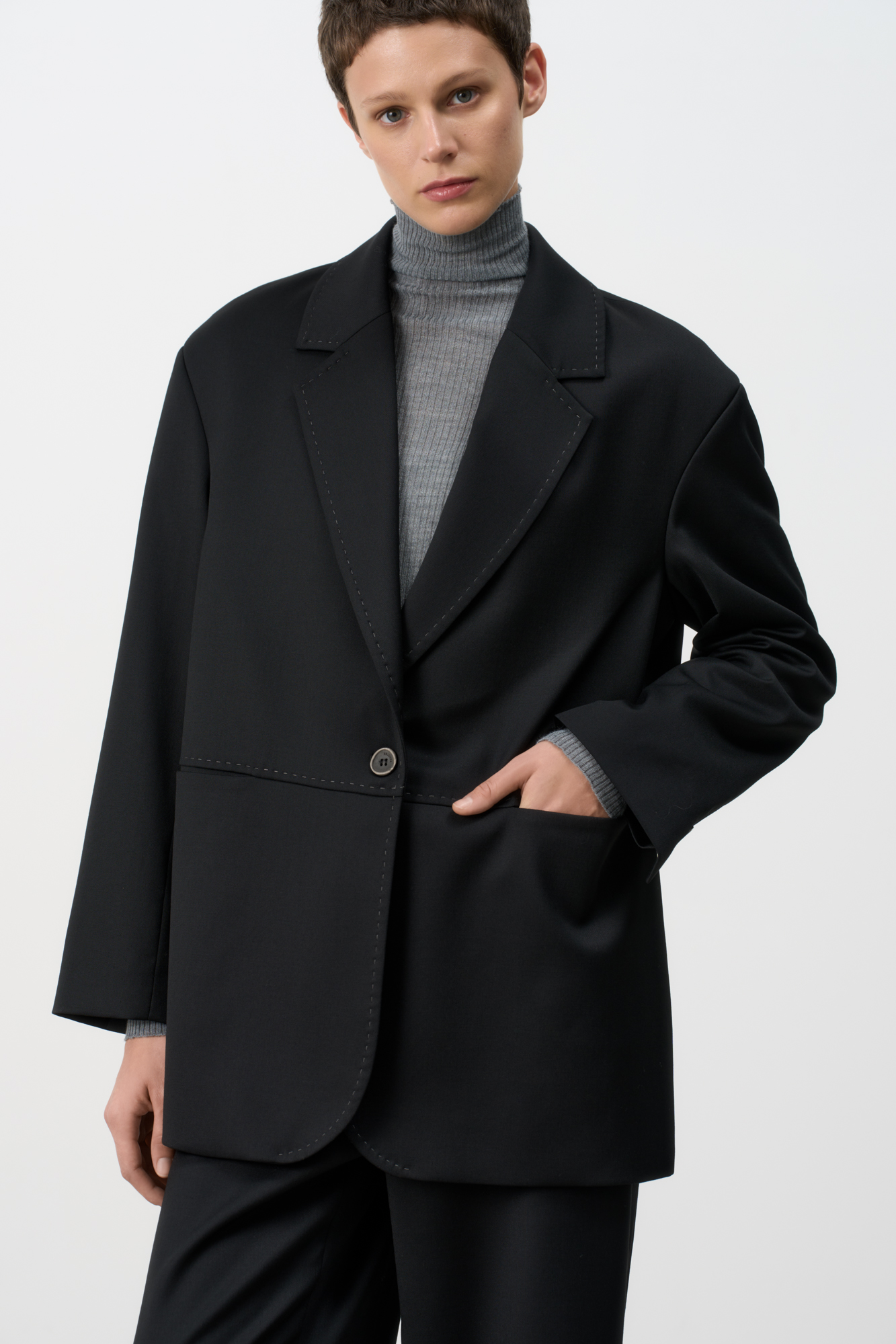Single-breasted jacket with front pockets. Loose silhouette model with dropped shoulder line. You can complement the look with trousers in the same style.