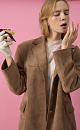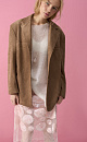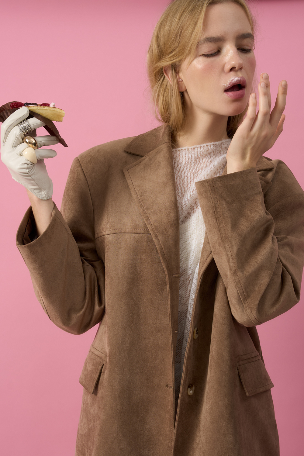 Single-breasted jacket made of fabric with an imitation of the appearance and properties of natural suede. Model with a classic turn-down collar and side pockets with flaps. Finished with tone-on-tone stitching. Three button closure. The product is lined.