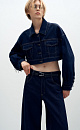 Short straight-fit denim jacket with a turn-down collar and tabs at the waist. The jacket is decorated with patch pockets on the chest, half rings on the cuffs and a branded label on the back. Button closure.