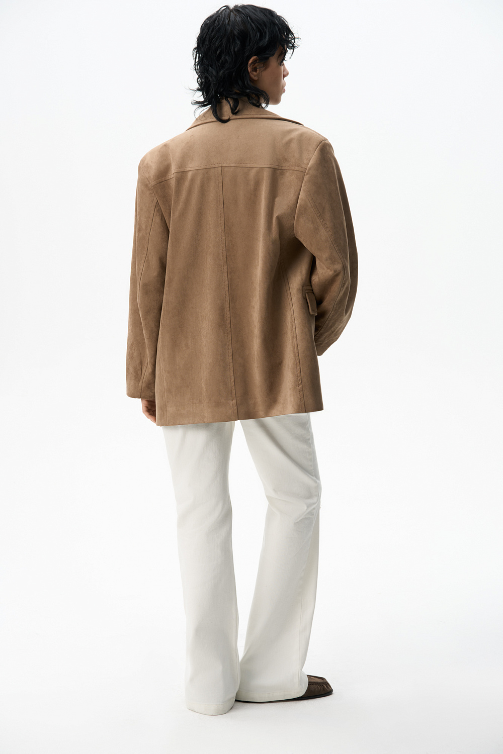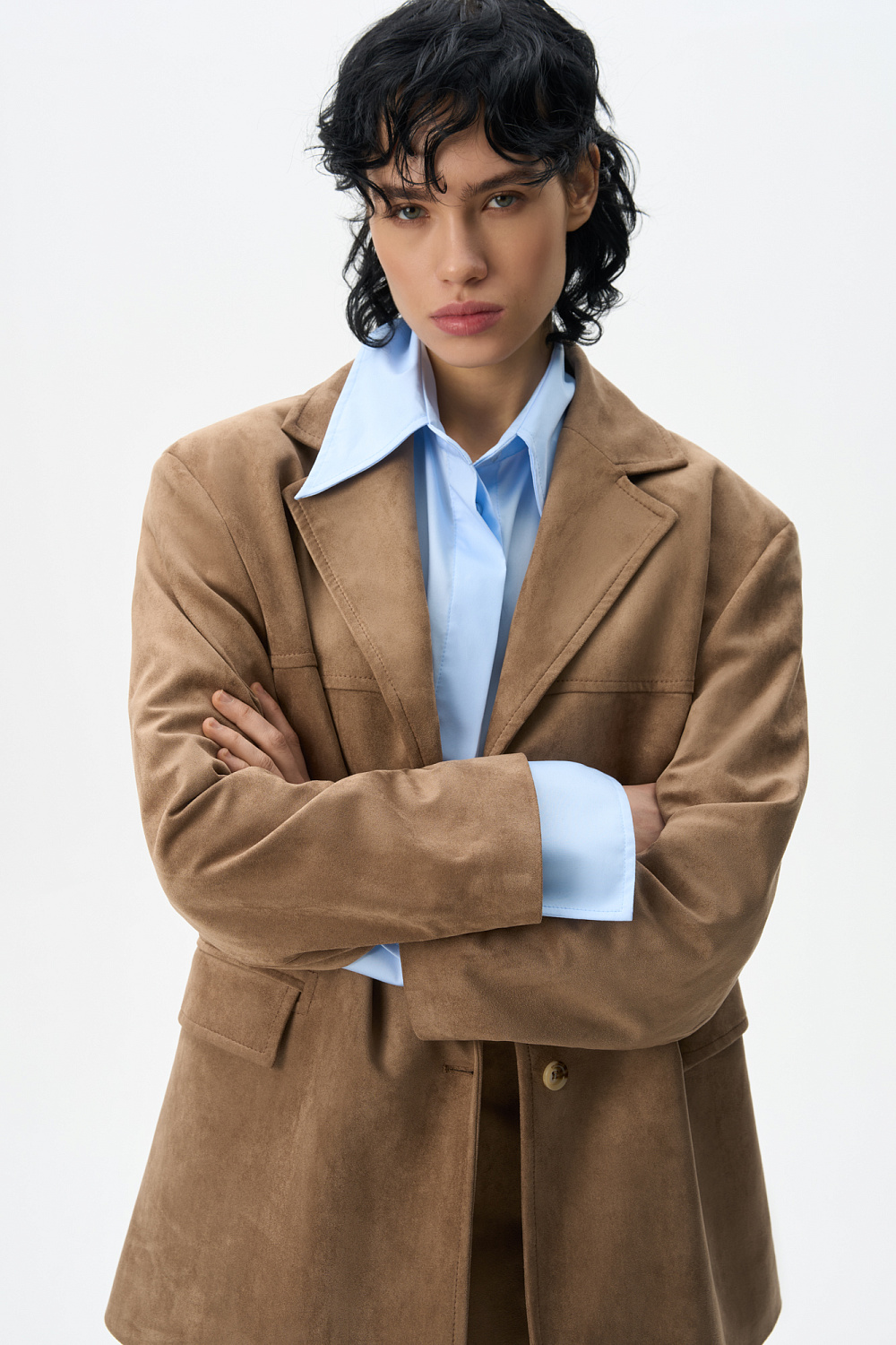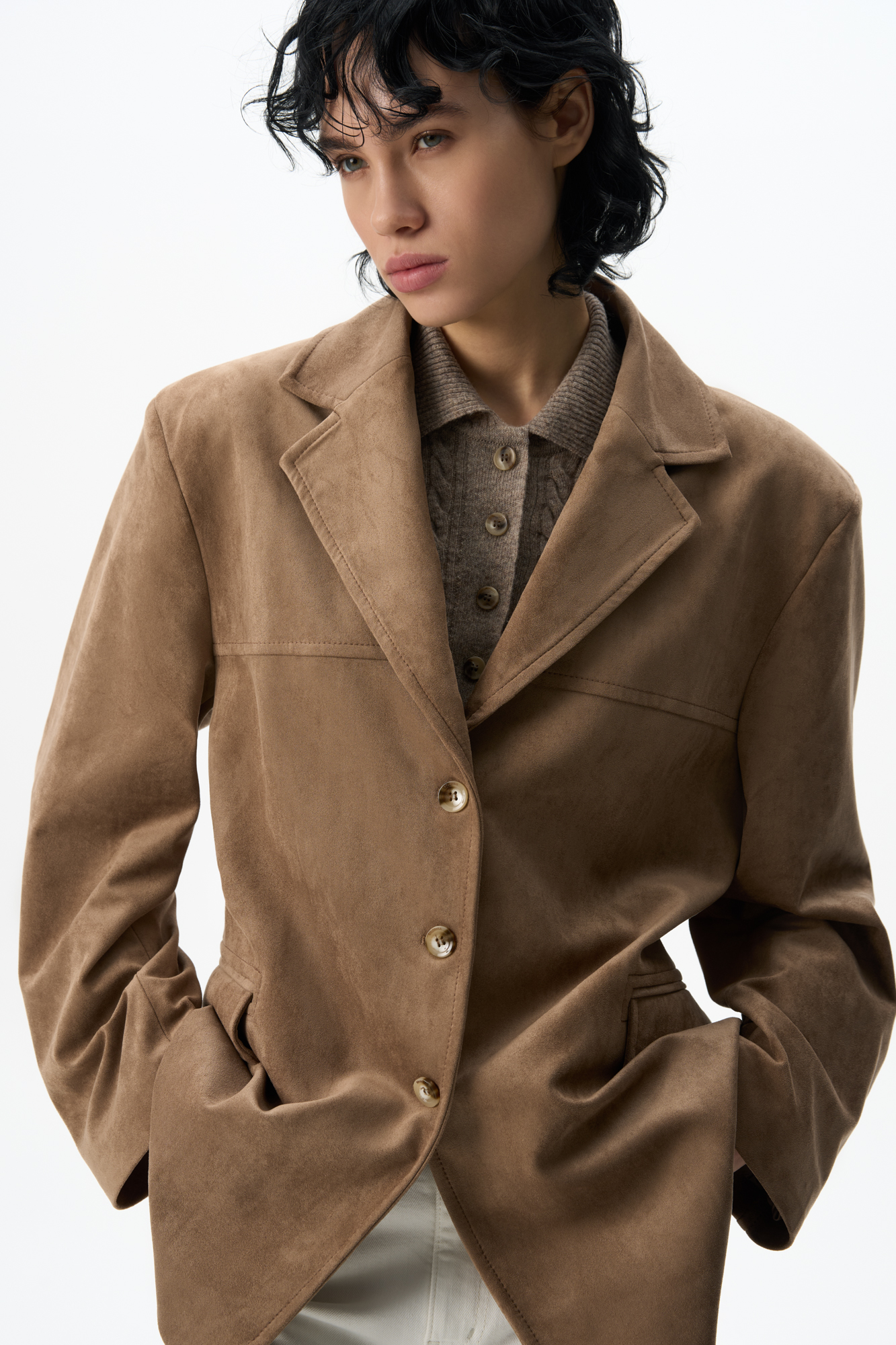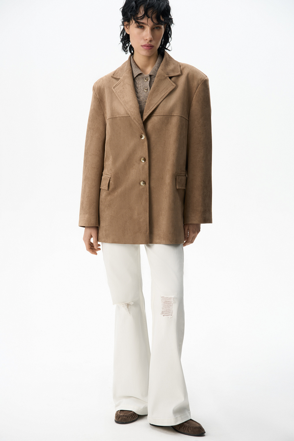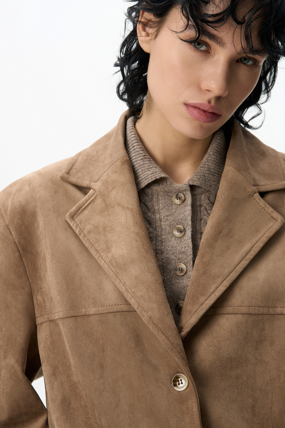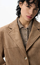 Single-breasted jacket made of fabric with an imitation of the appearance and properties of natural suede. Model with a classic turn-down collar and side pockets with flaps. Finished with tone-on-tone stitching. Three button closure. The product is lined.