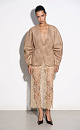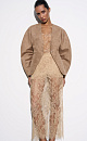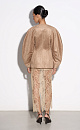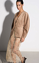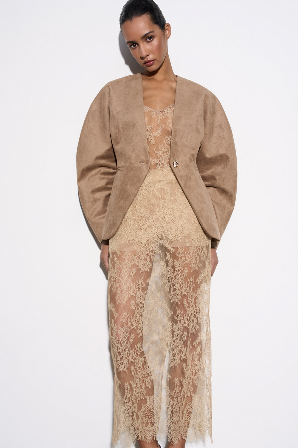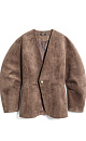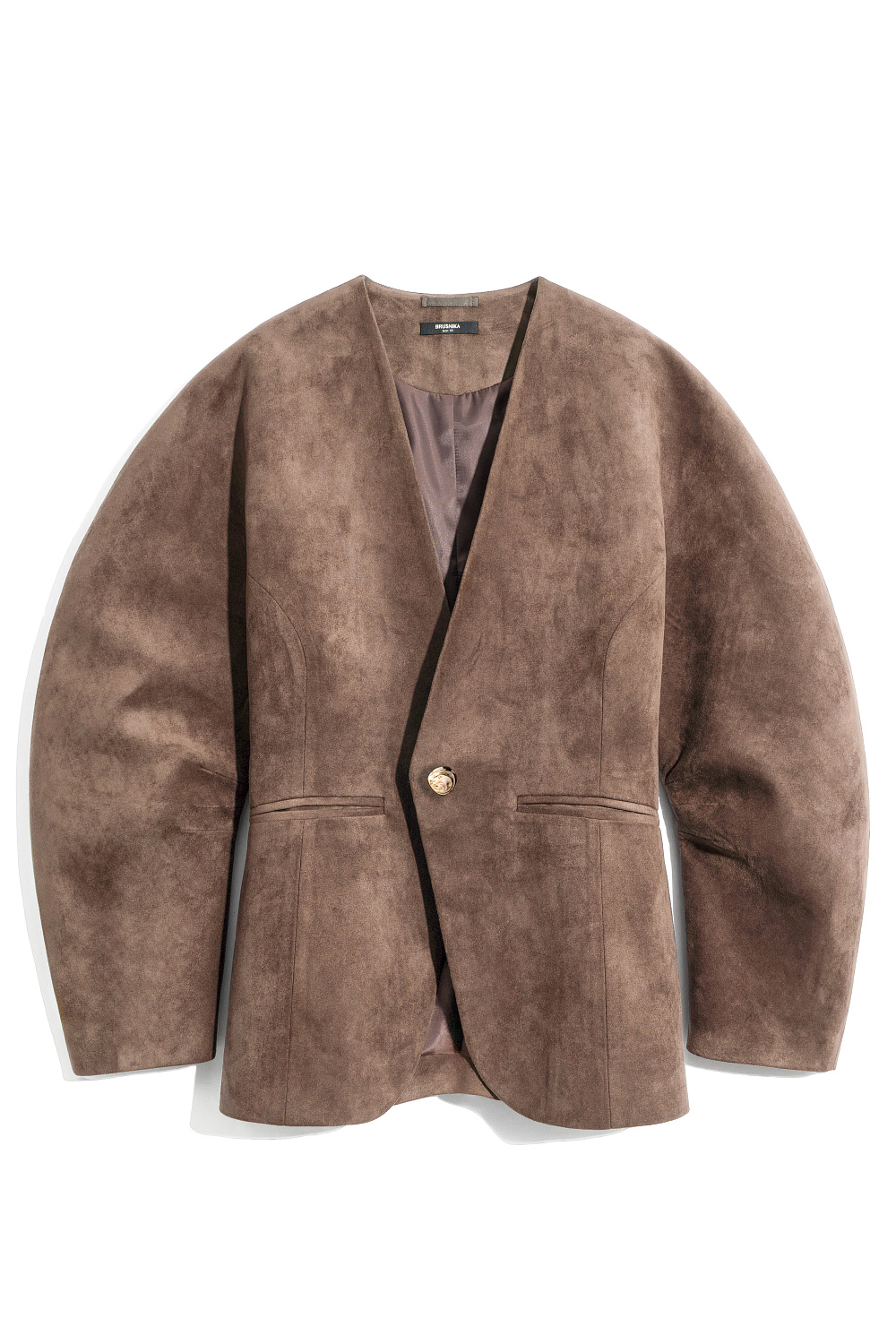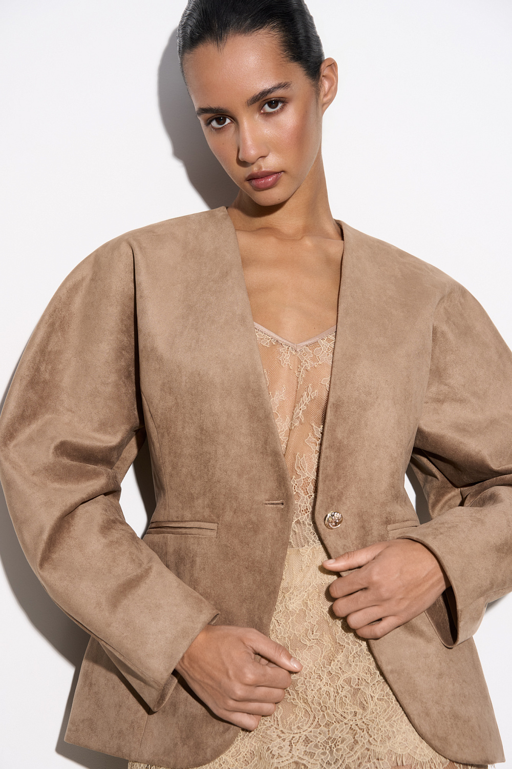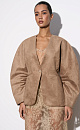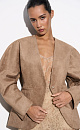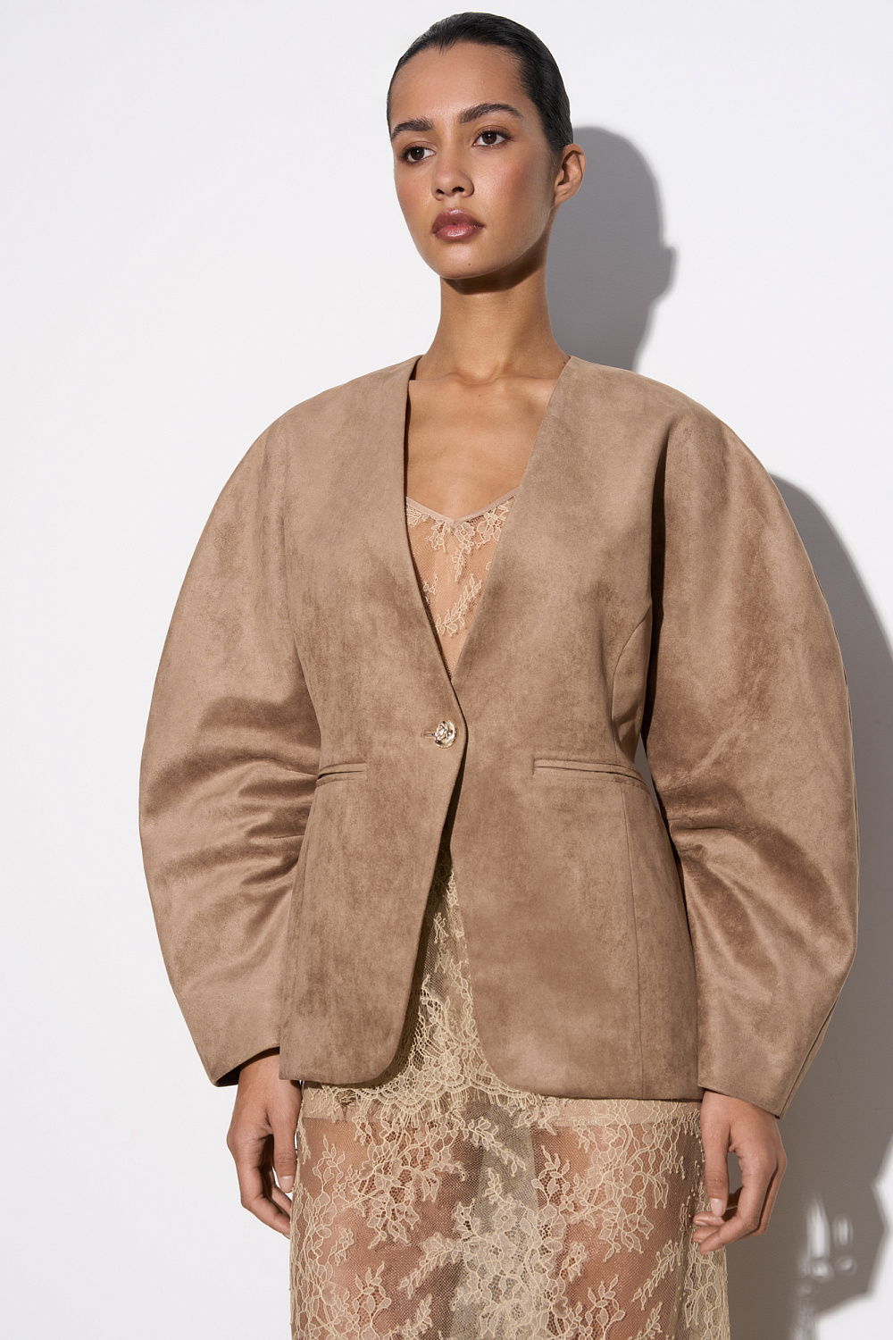 Single-breasted jacket made of fabric with an imitation of the appearance and properties of natural suede. Model without lapels with large voluminous sleeves and side welt pockets. The product is lined.