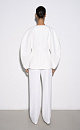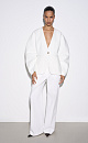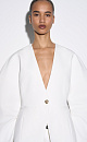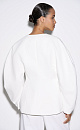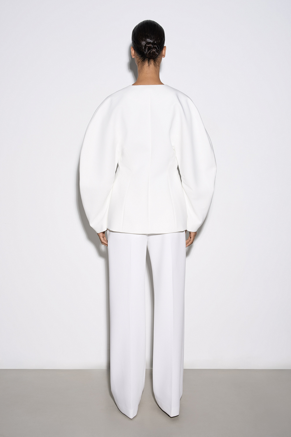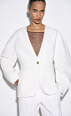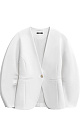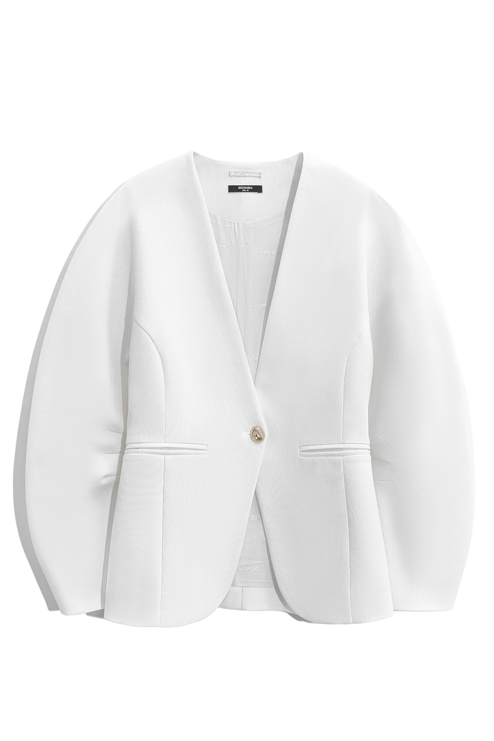 Single-breasted viscose jacket. Model without lapels with large voluminous sleeves and side welt pockets. The product is lined. Single button closure.