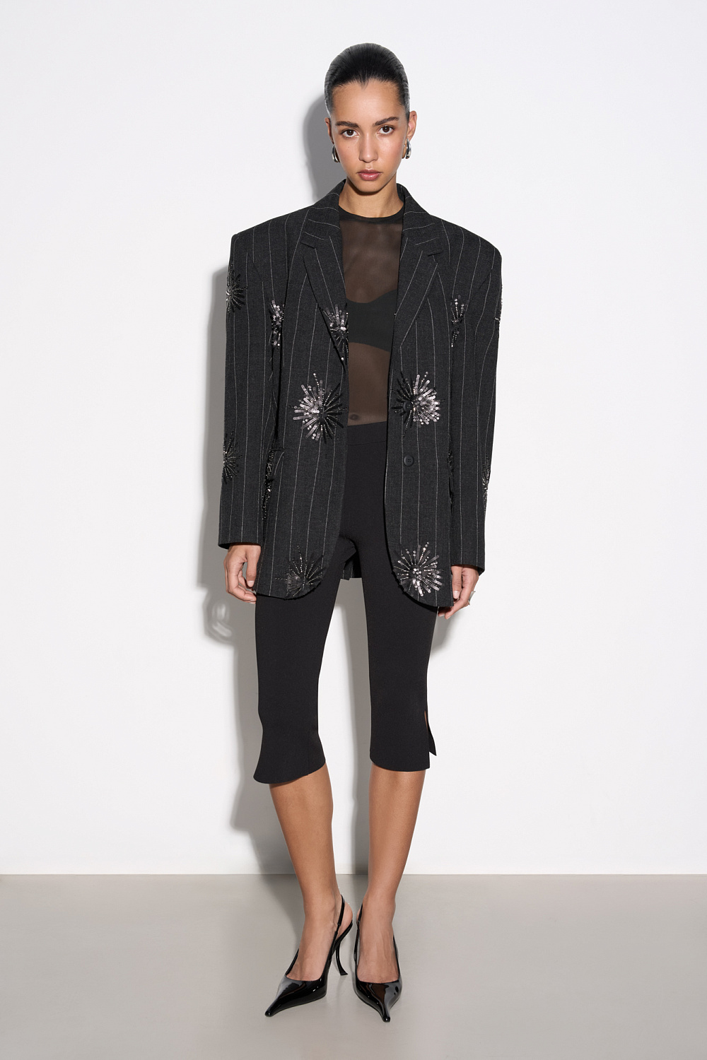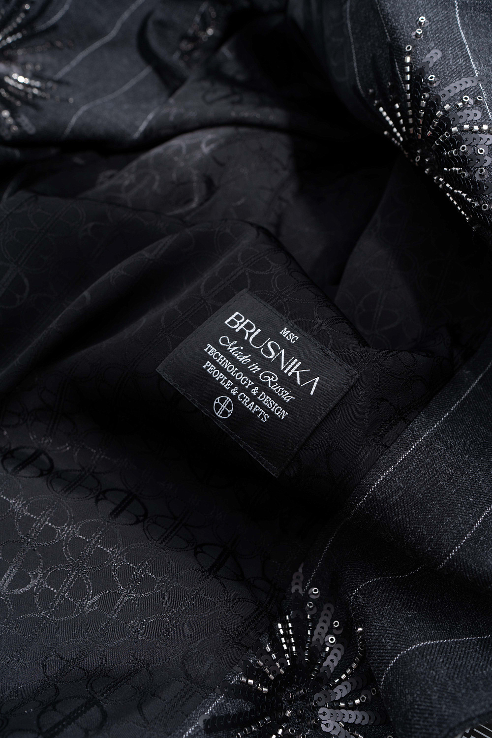 Single-breasted wool jacket, decorated with a sequin pattern. Straight fit model with narrow lapels, wide shoulders, side pockets with flaps and two button closure. The product is lined.