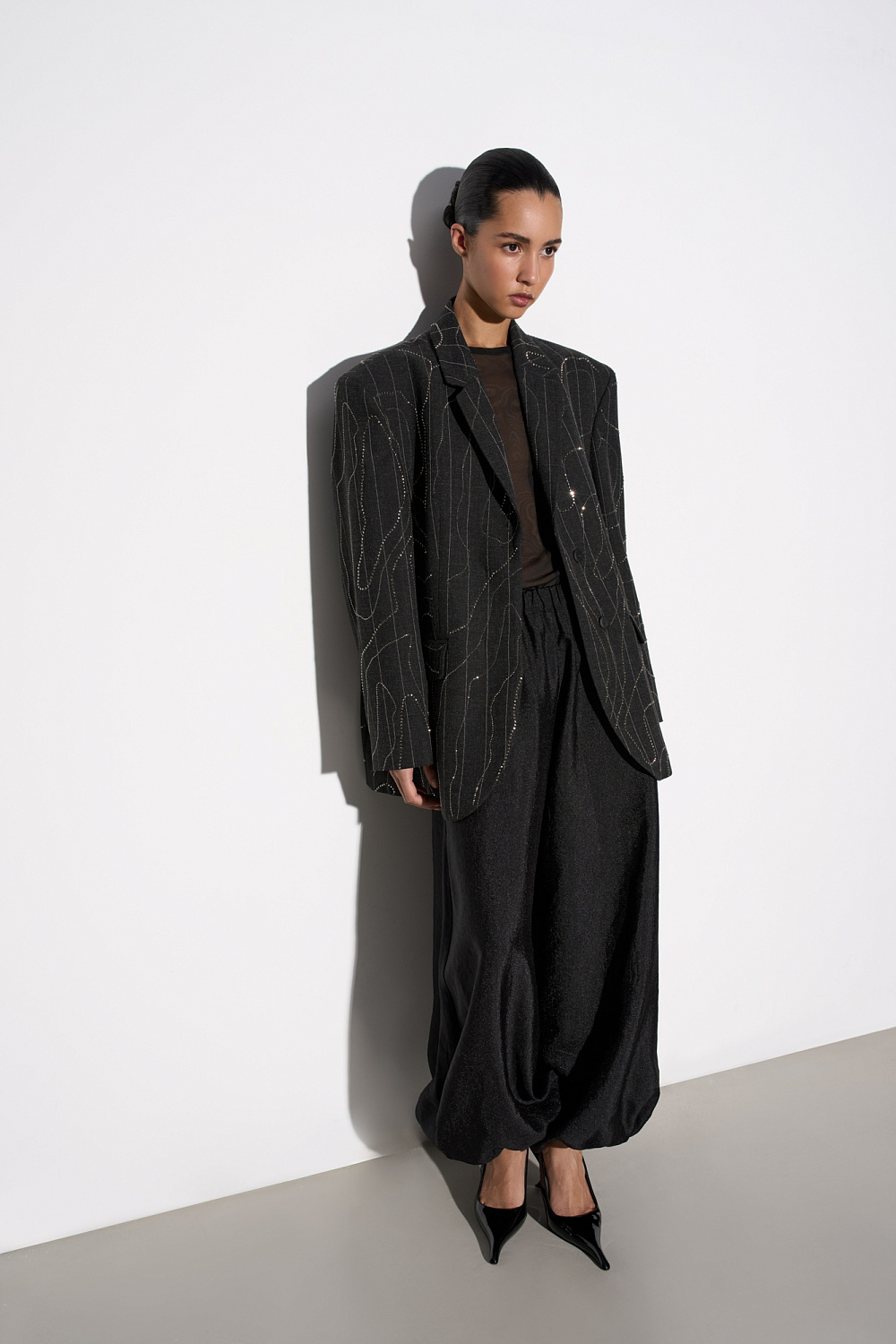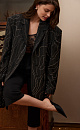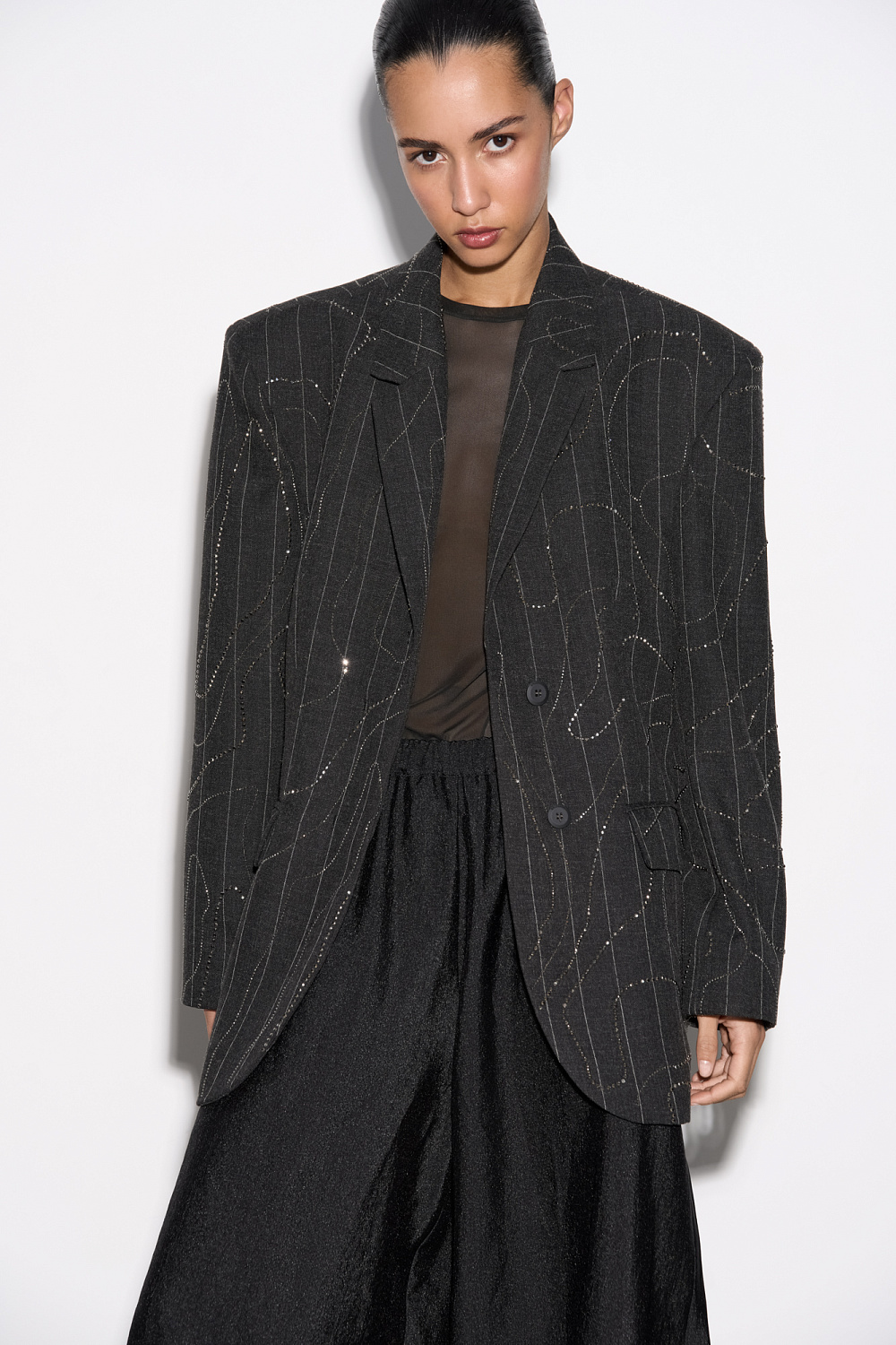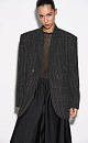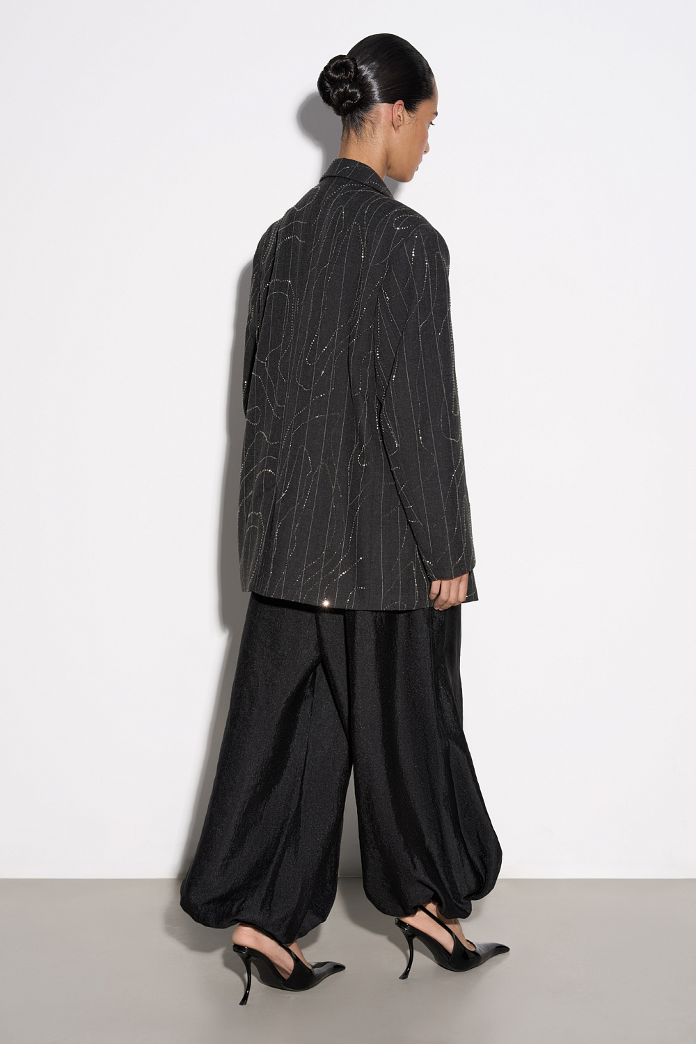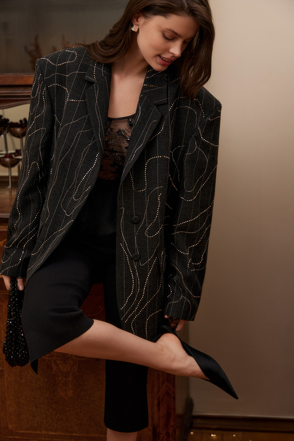 Single-breasted jacket made of wool, decorated with a rhinestone pattern. Straight fit model with narrow lapels, wide shoulders, side pockets with flaps and two button closure. The product is lined.