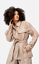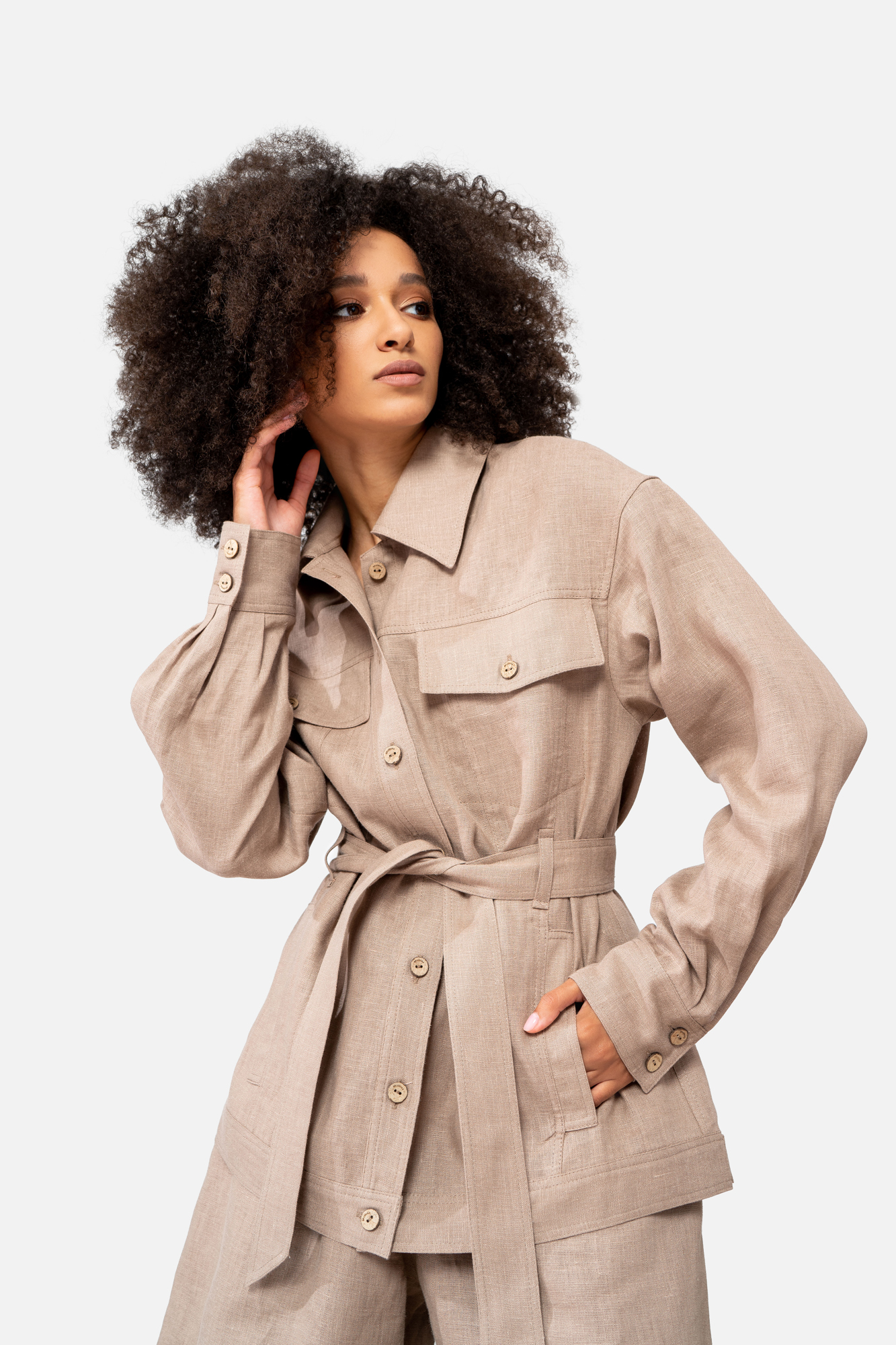A linen jacket with a belt will give the image of severity and creativity, the overhead pockets on the buttons focus on the upper part of the torso, adding volume.