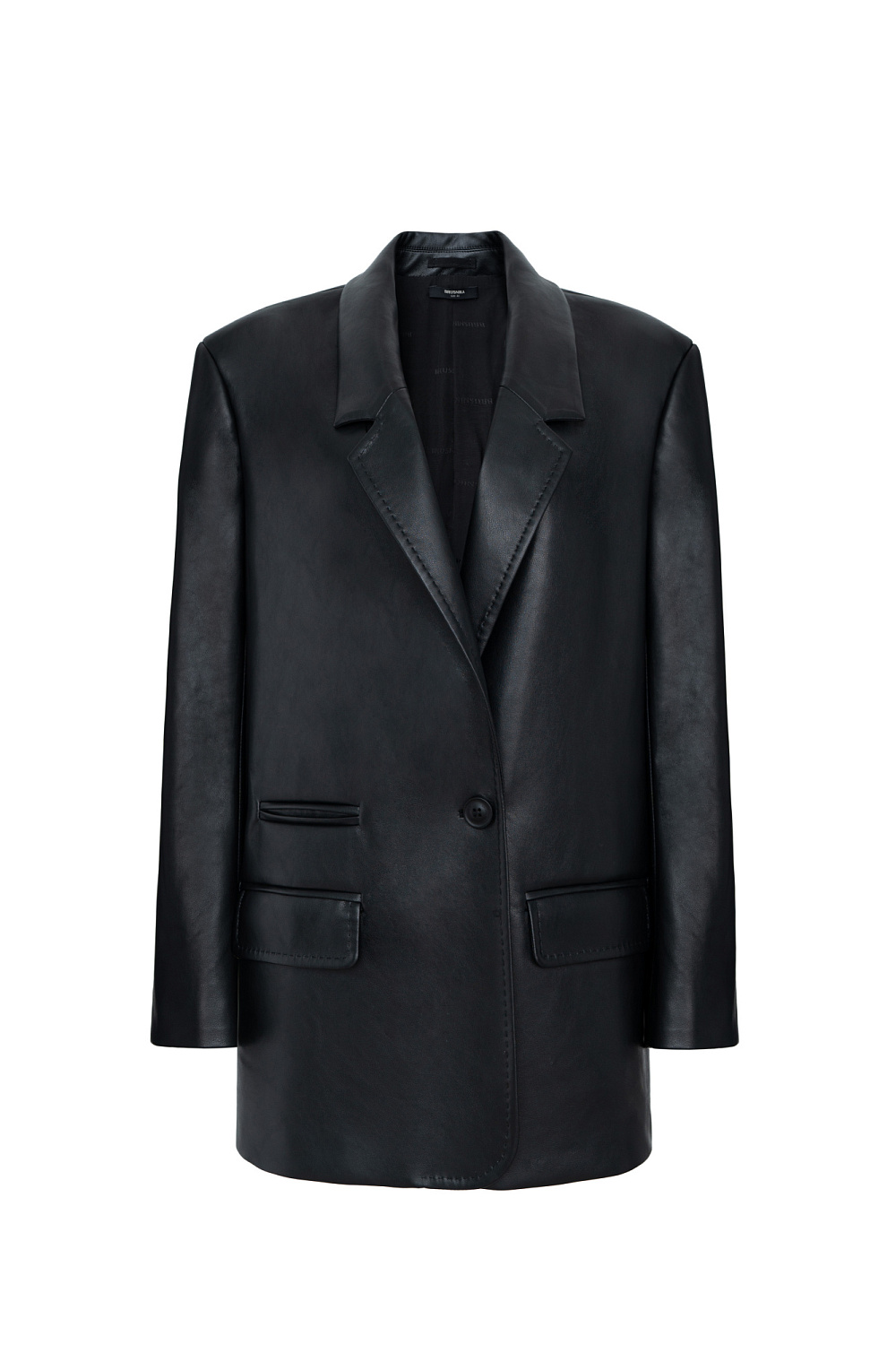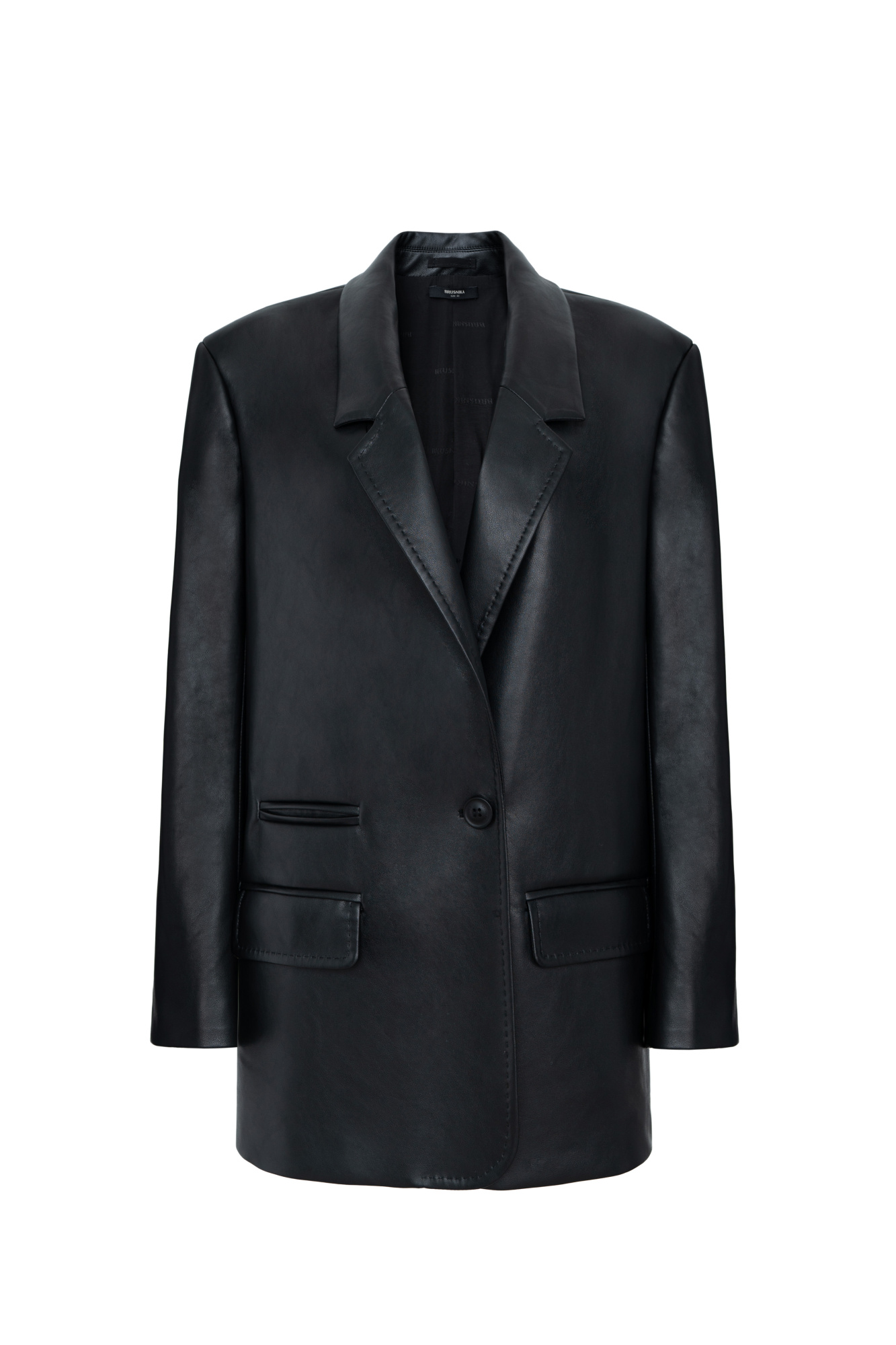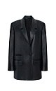 Oversized single-breasted blazer with faux pockets and button fastening. Made of faux-leather with 100% viscose lining.
