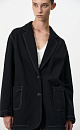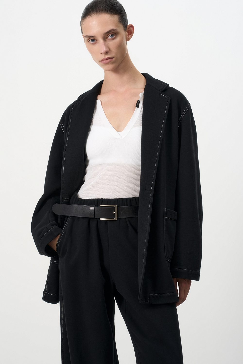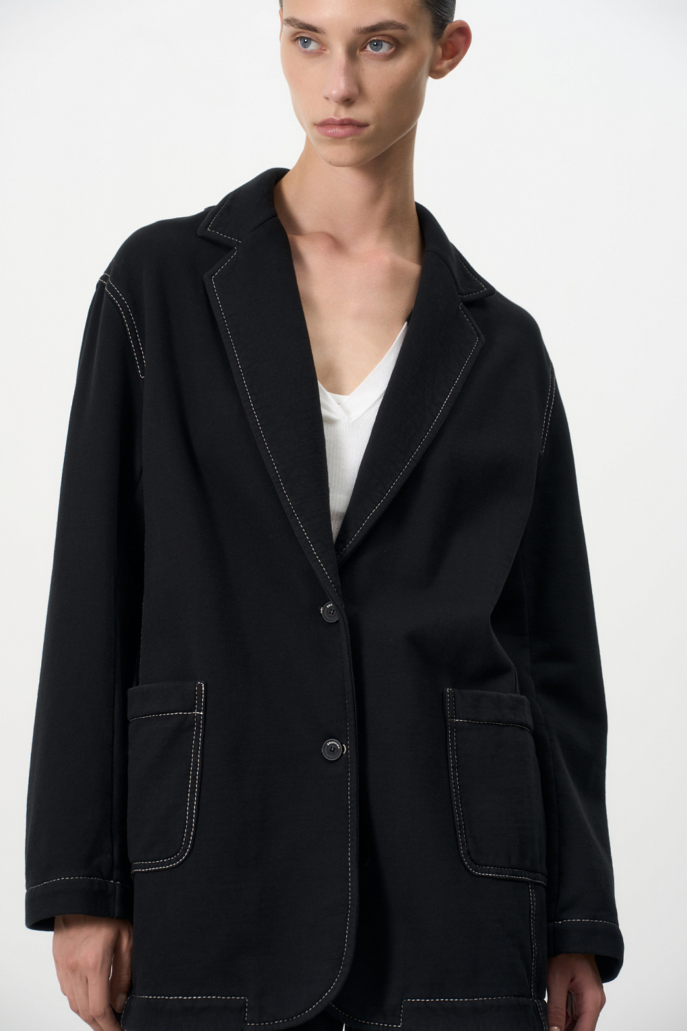 Single-breasted jacket with a loose silhouette. Model with patch pockets, dropped shoulders and contrast stitching. You can complement the look with trousers in the same style.