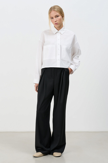 Classic single-breasted jacket. The model has a loose silhouette with a turn-down collar, wide sleeves and patch pockets with flaps. Button closure. The product is lined.