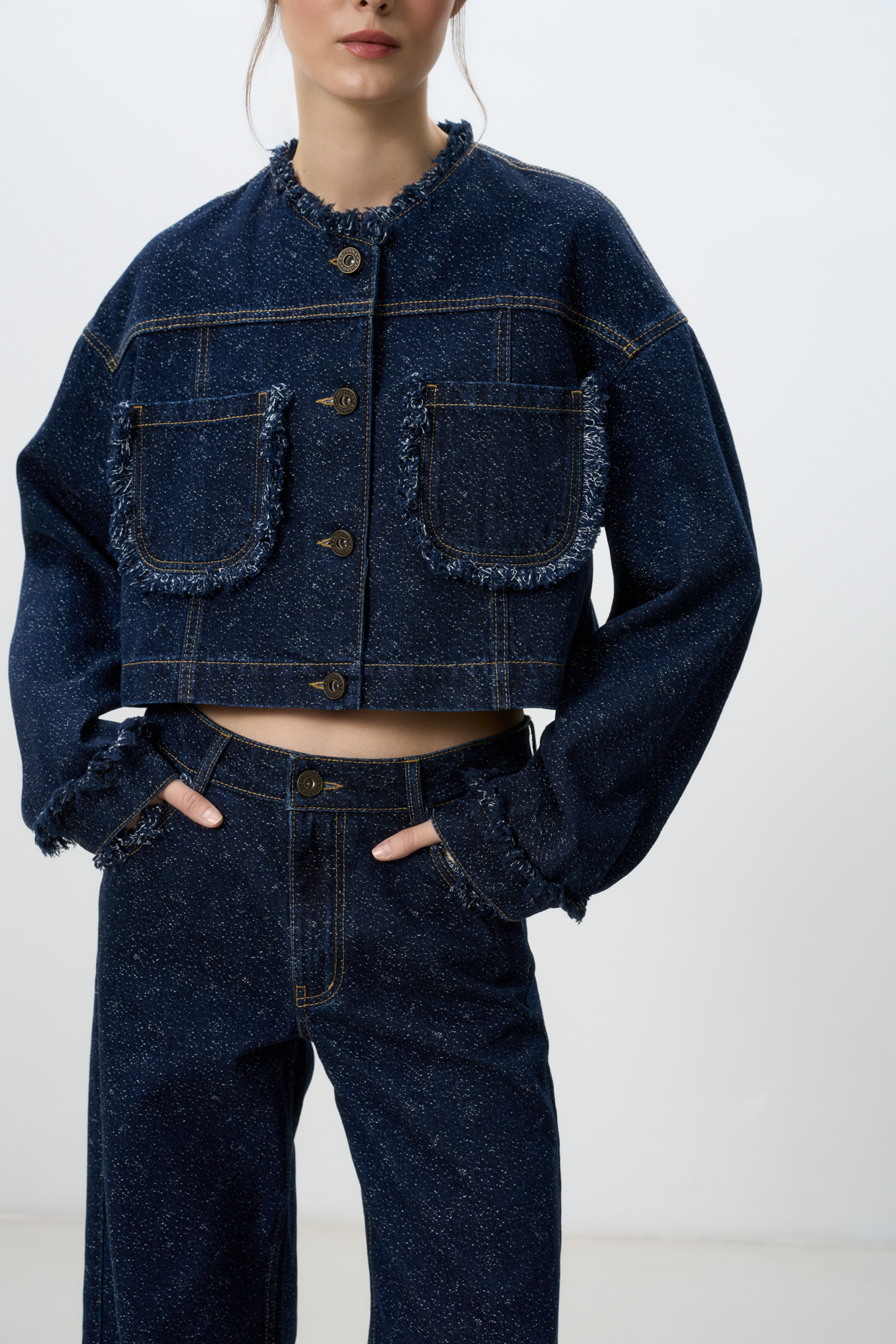 Denim jacket made of 100% cotton. Loose silhouette model with dropped shoulders and patch pockets. Fastening with metal buttons. The product is decorated with fringe on the pockets, sleeve cuffs and collar. You can complement the look with a skirt in the same style.