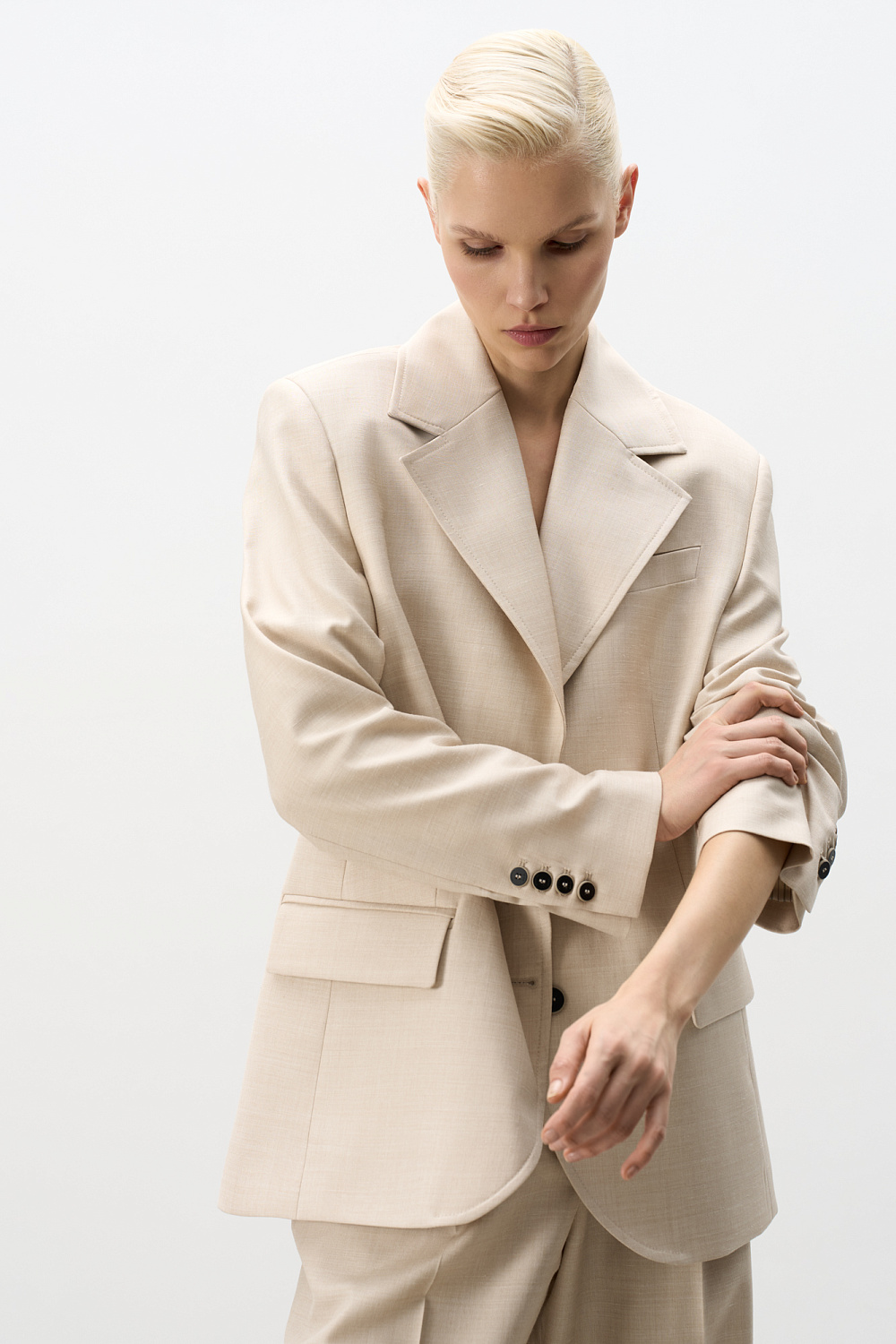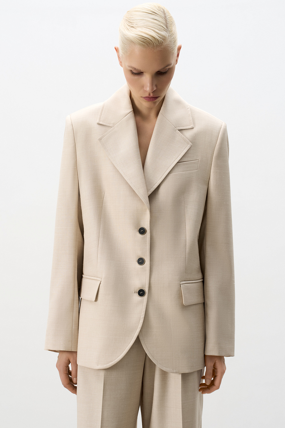 Single-breasted wool jacket. Relaxed silhouette with lapels, side pockets with flaps and a chest pocket. Three button closure. The product is lined. You can complement the look with trousers or a skirt.