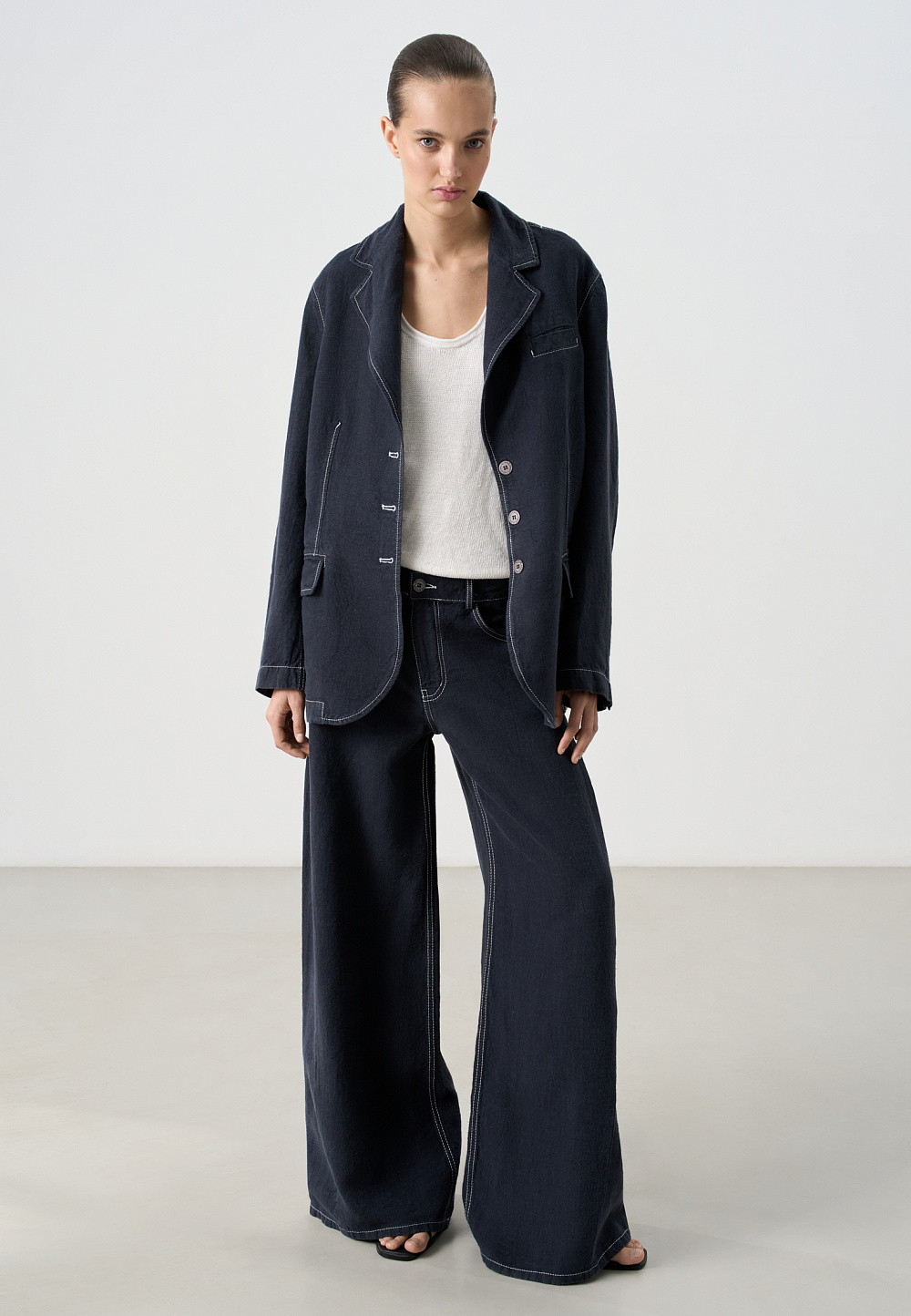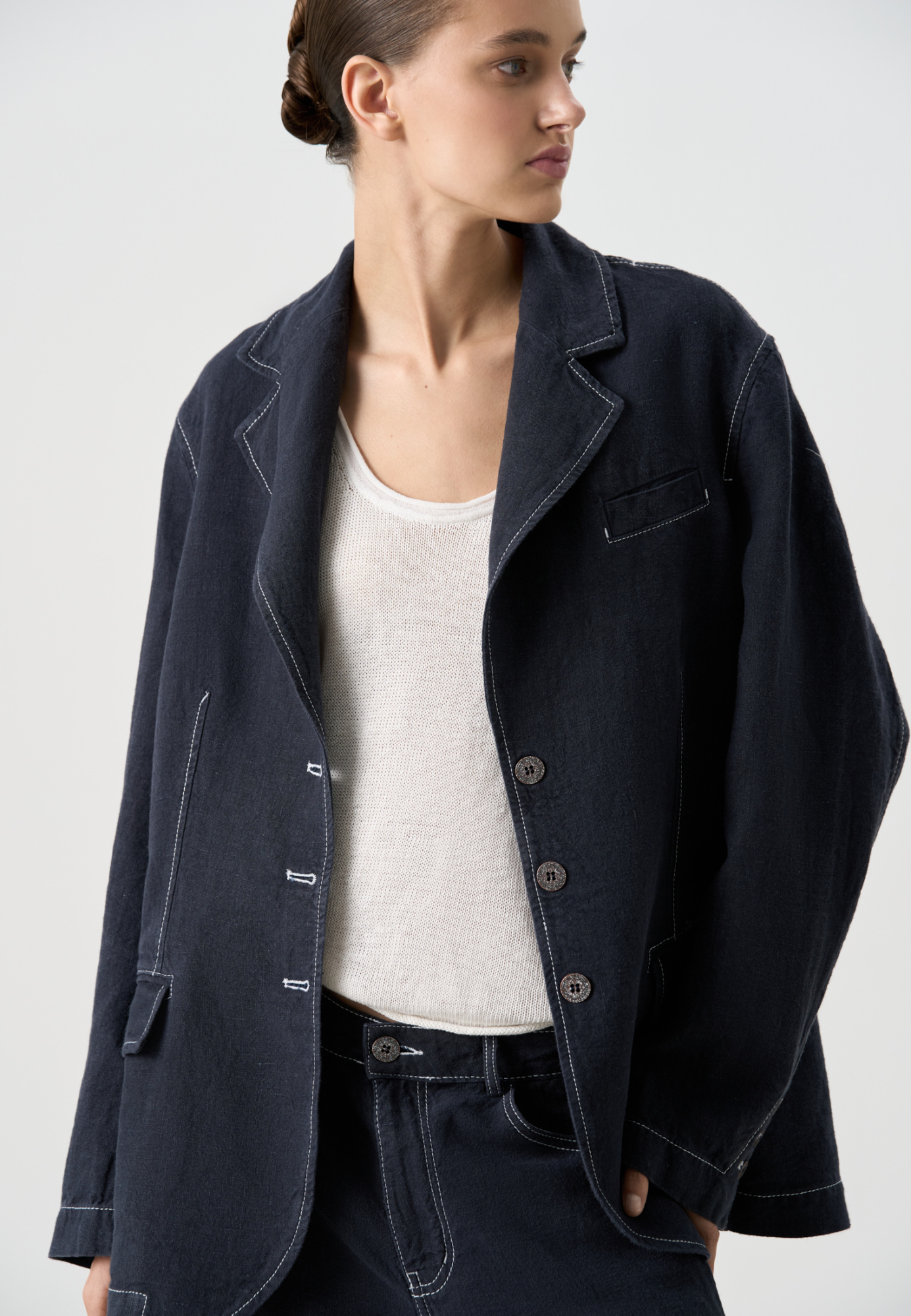 Classic single-breasted jacket made of 100% linen. The model has a straight fit, wide lapels and a three-button closure. Chest and two welt pockets with flaps. The product is decorated with stitching in a contrasting color.