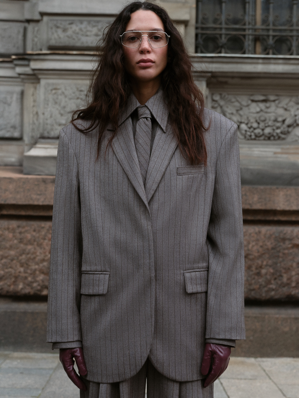 Single breasted striped jacket. Straight cut model with narrow lapels, chest pocket, side pockets with flaps and buttons on the sleeves. Fastening with hidden buttons under the placket. The product is lined.