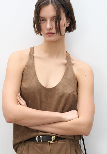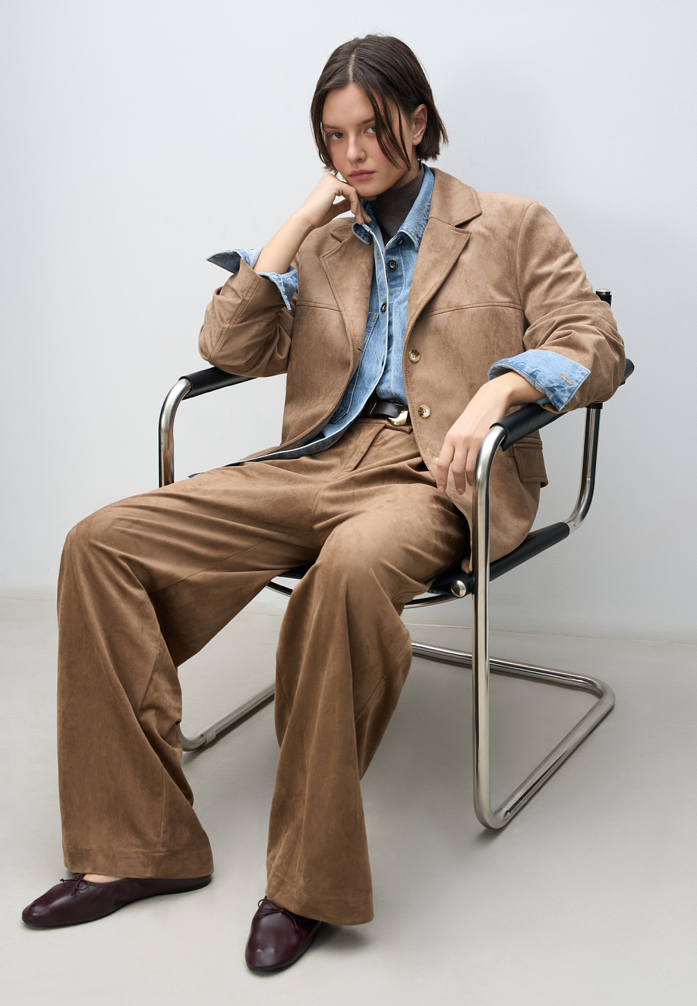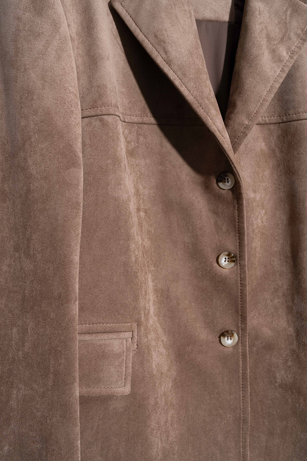 Single-breasted jacket made of fabric with an imitation of the appearance and properties of natural suede. Model with a classic turn-down collar and side pockets with flaps. Finished with tone-on-tone stitching. Three button closure. The product is lined.