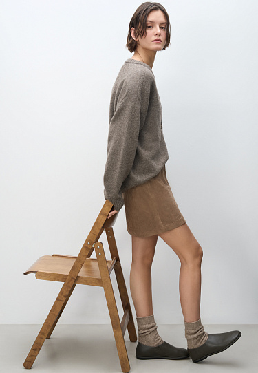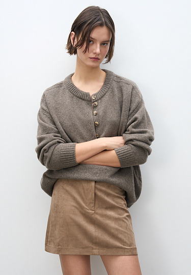 Single-breasted jacket made of fabric with an imitation of the appearance and properties of natural suede. Model without lapels with large voluminous sleeves and side welt pockets. The product is lined.