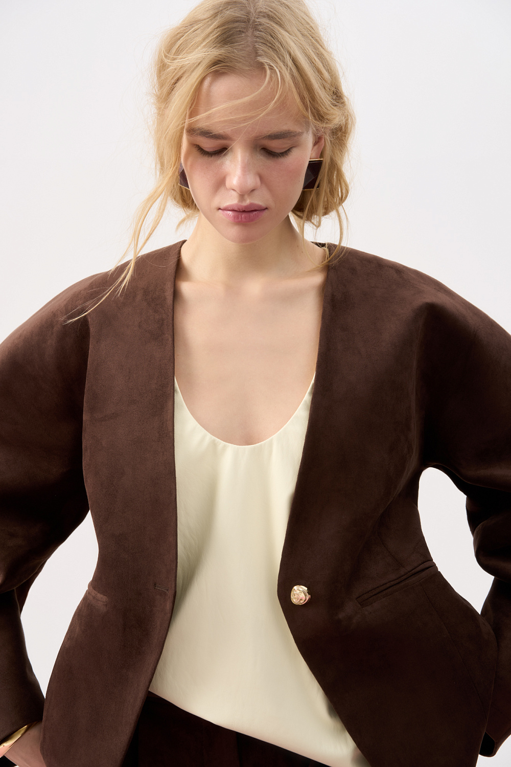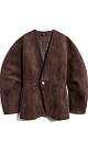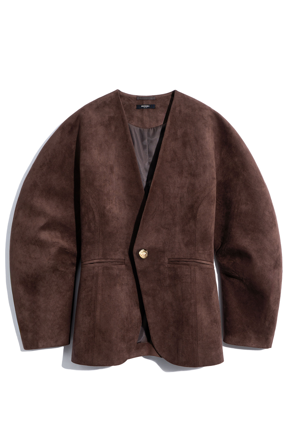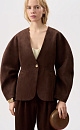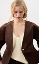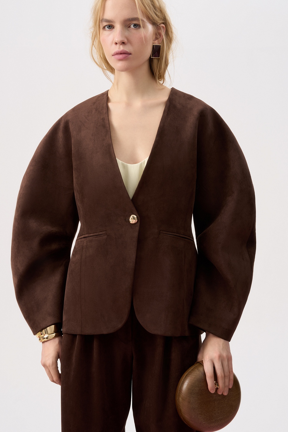 Single-breasted jacket made of fabric with an imitation of the appearance and properties of natural suede. Model without lapels with large voluminous sleeves and side welt pockets. The product is lined.