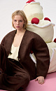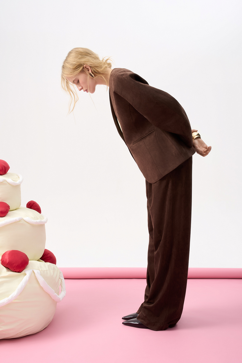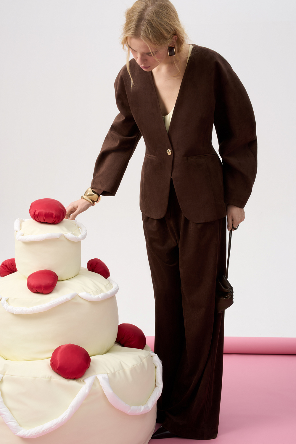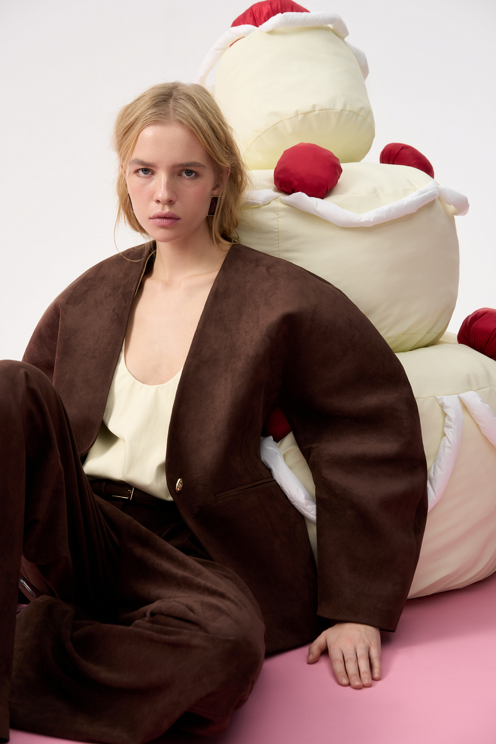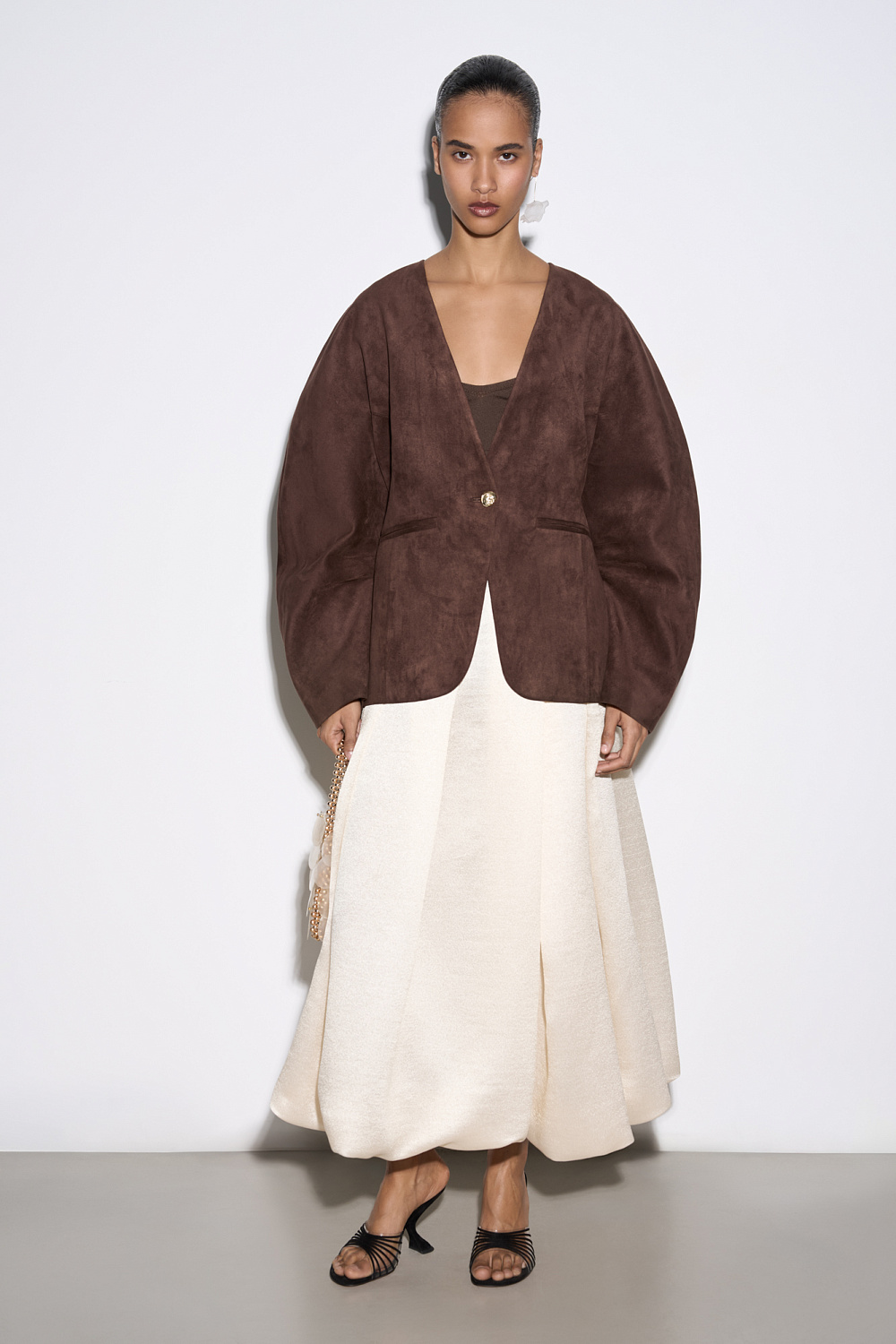Single-breasted jacket made of fabric with an imitation of the appearance and properties of natural suede. Model without lapels with large voluminous sleeves and side welt pockets. The product is lined.