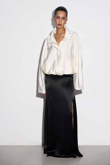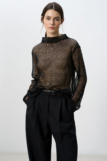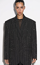 Single-breasted jacket made of wool, decorated with a rhinestone pattern. Straight fit model with narrow lapels, wide shoulders, side pockets with flaps and two button closure. The product is lined.