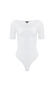 Ribbed knit bodysuit. Features square neckline, short sleeves and hook-and-eye closure.