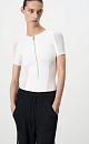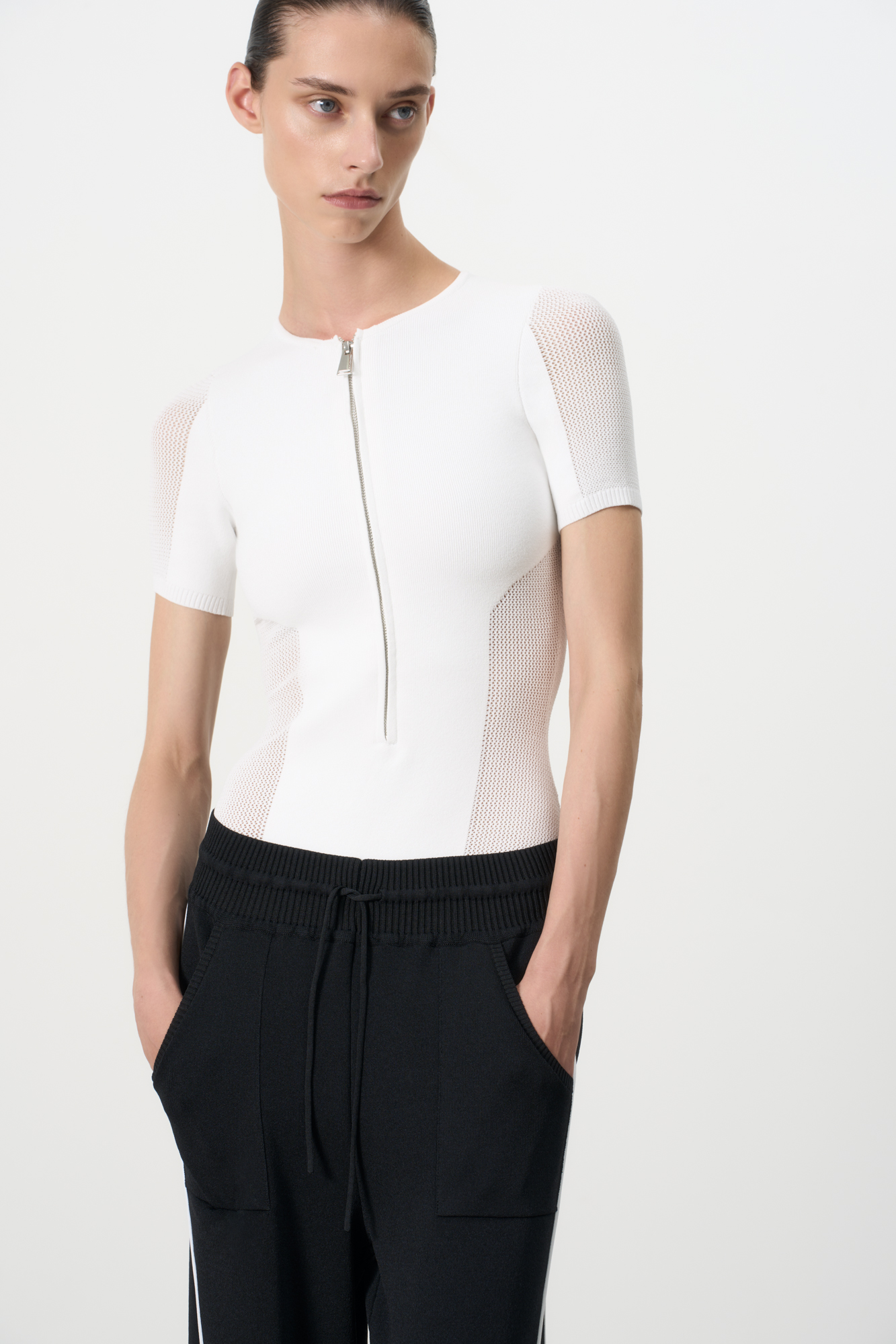 Knit bodysuit with short sleeves. Front zip and round cut on the back.