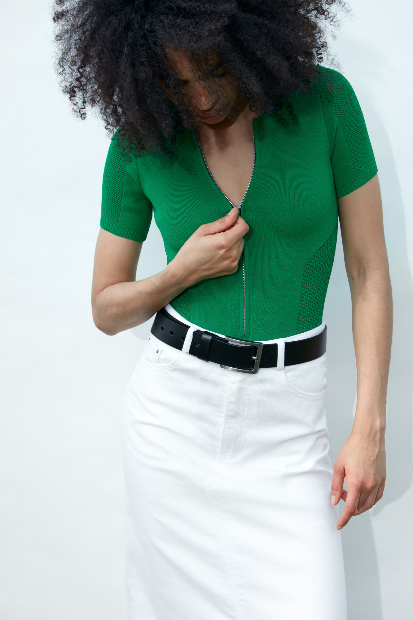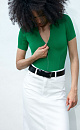 Knit bodysuit with short sleeves. Front zip and round cut on the back.