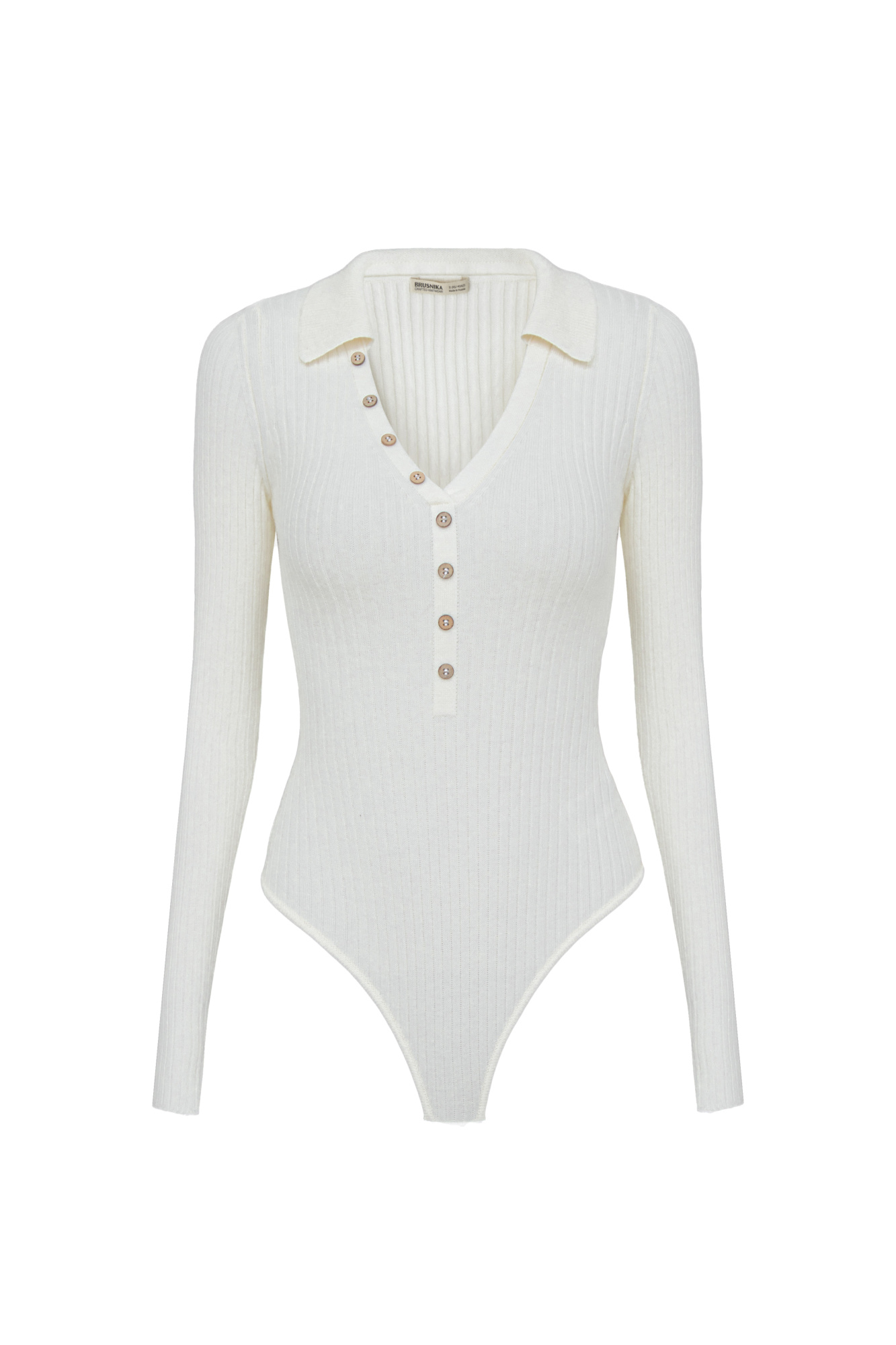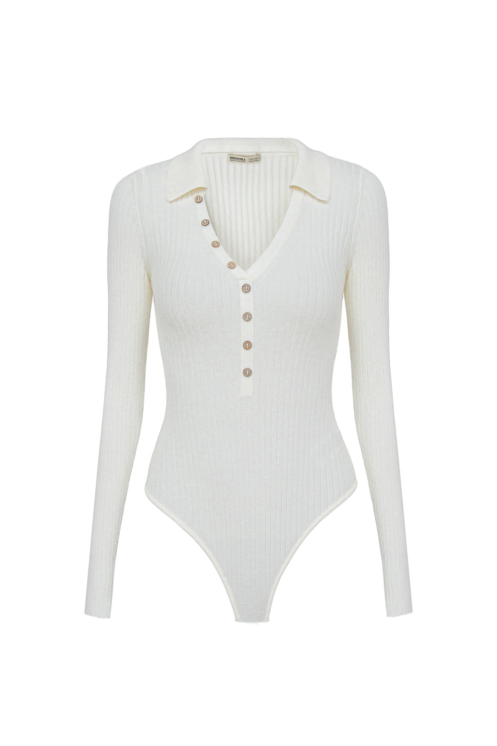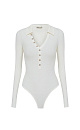 Cashmere and wool blend bodysuit with long sleeves, polo collar and V-neck.