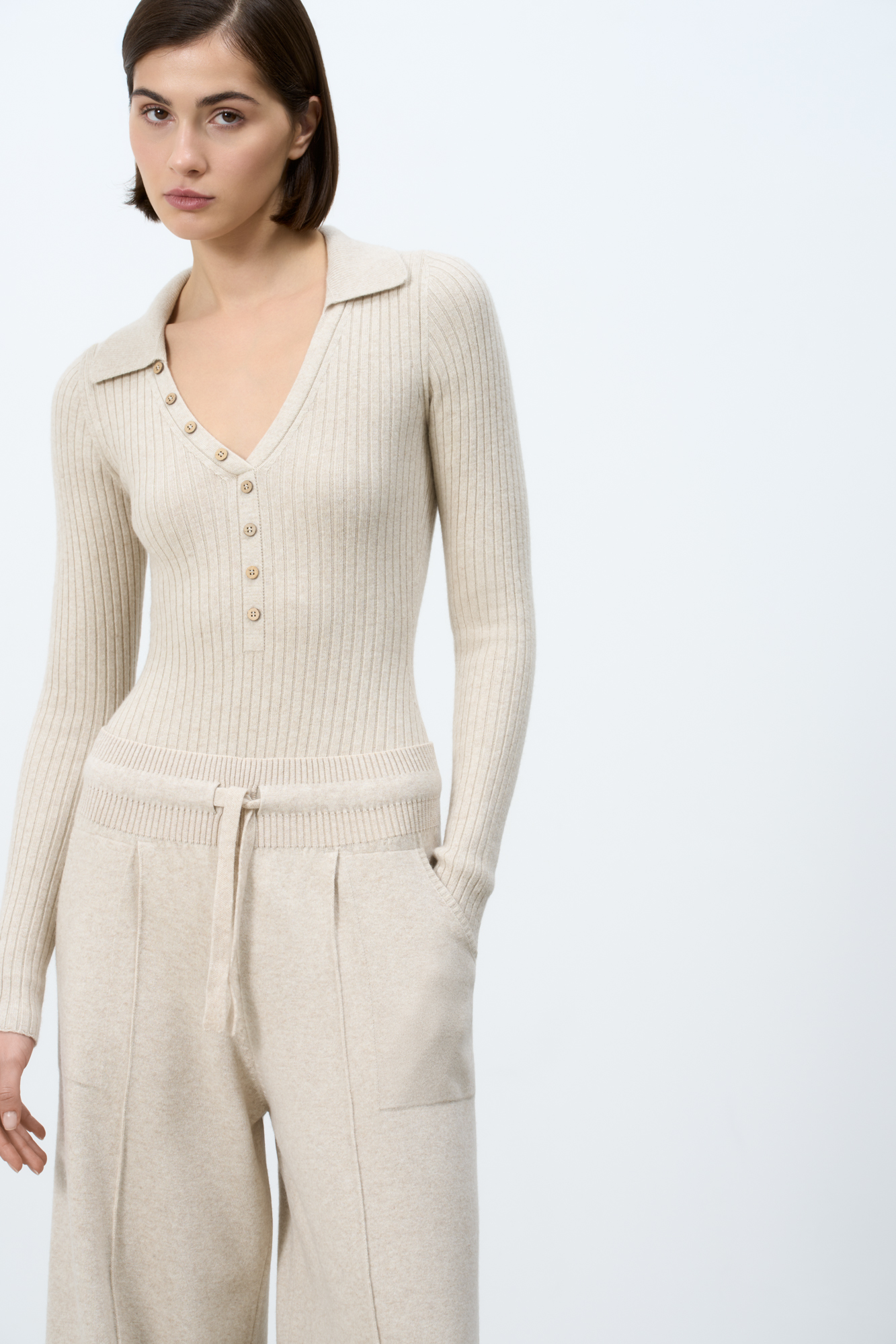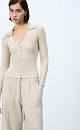 Cashmere and wool blend bodysuit with long sleeves, polo collar and V-neck.