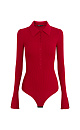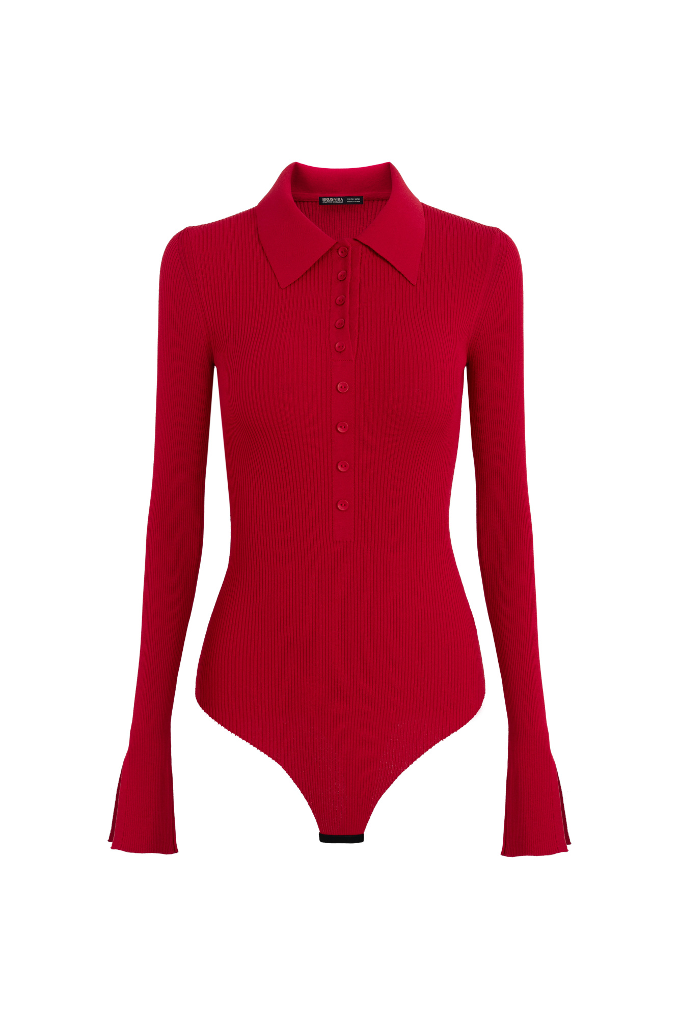 Knitted polyviscose bodysuit with polo collar and button closure.