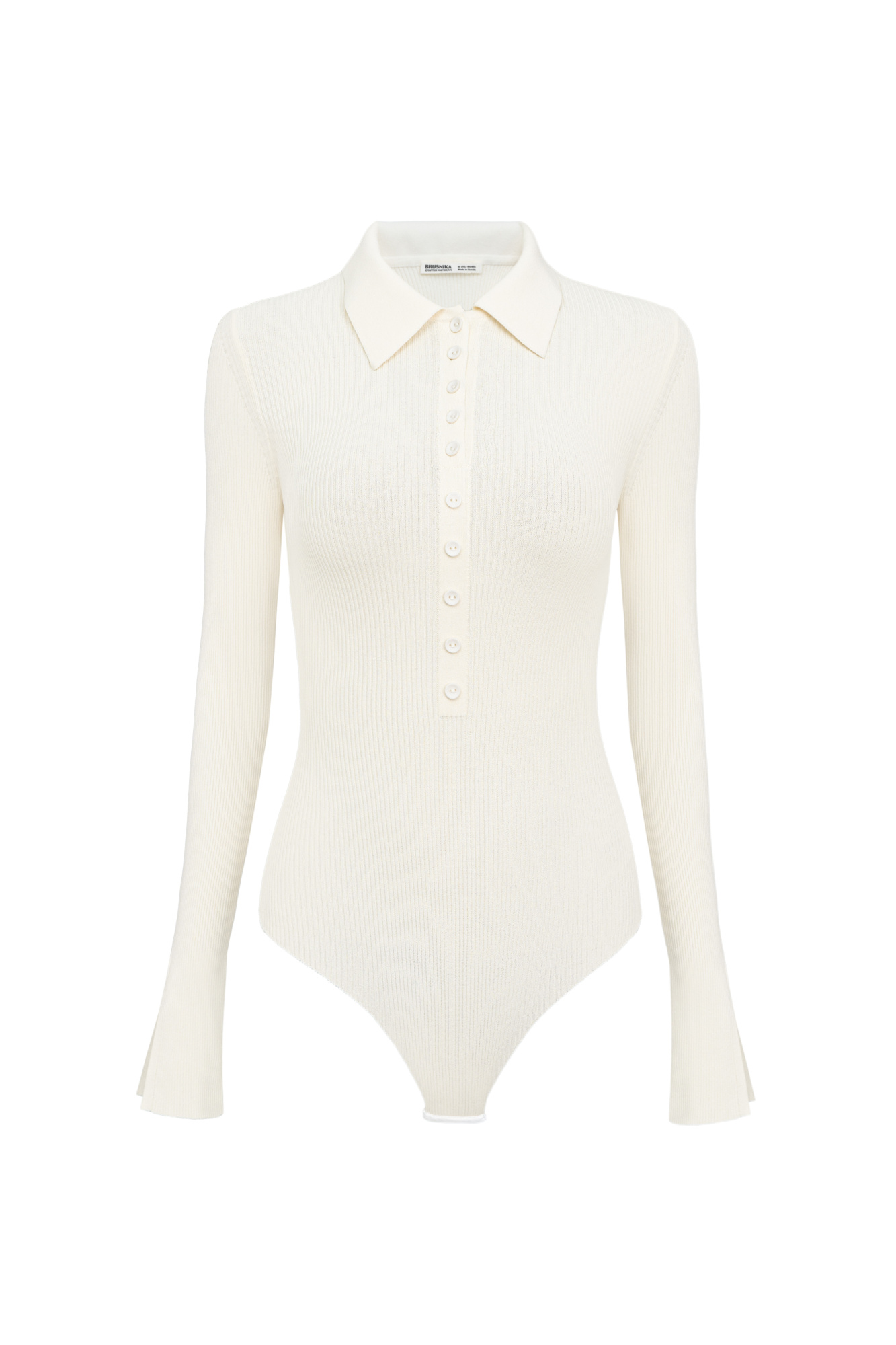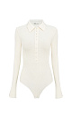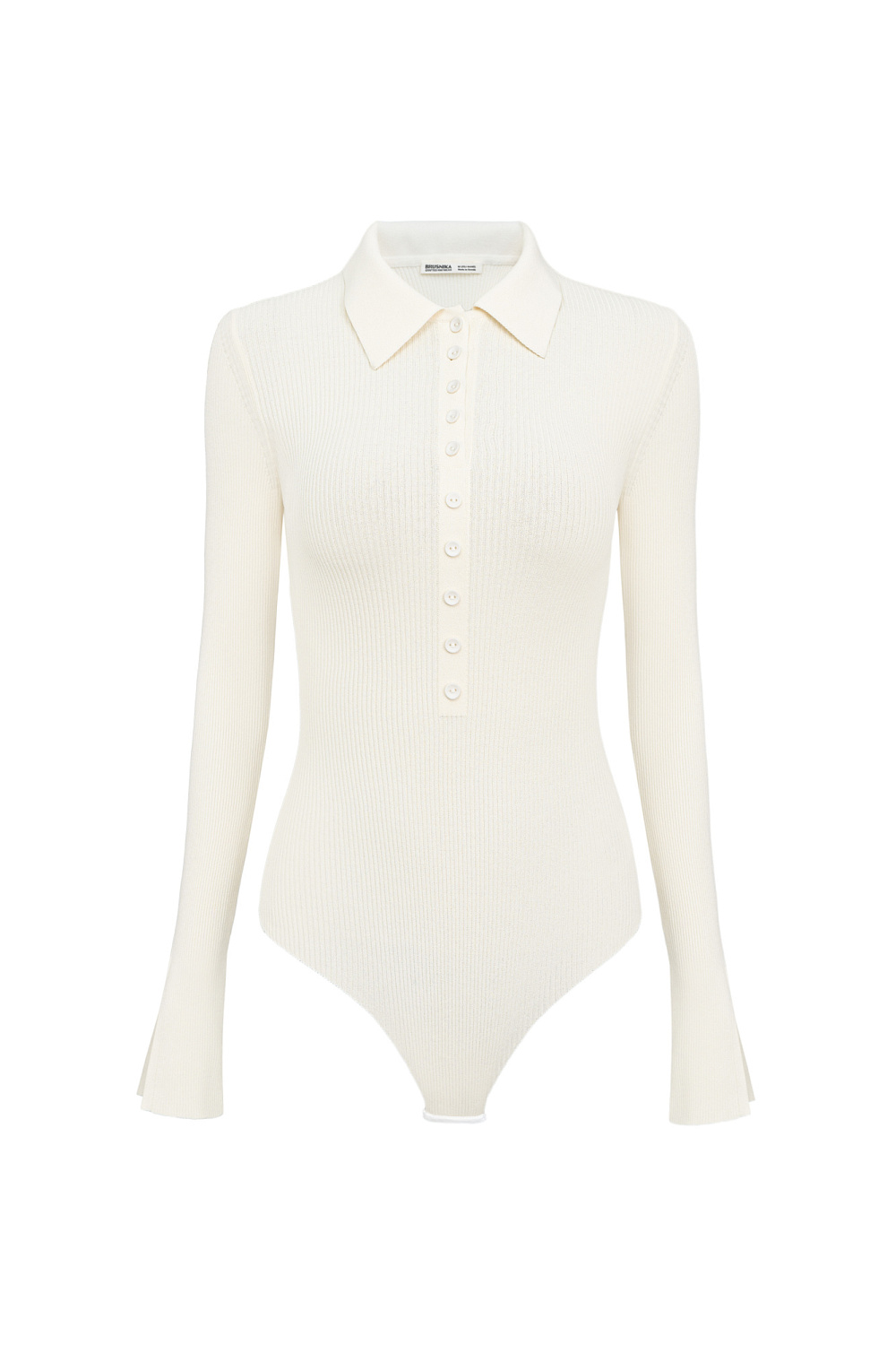 Knitted polyviscose bodysuit with polo collar and button closure.