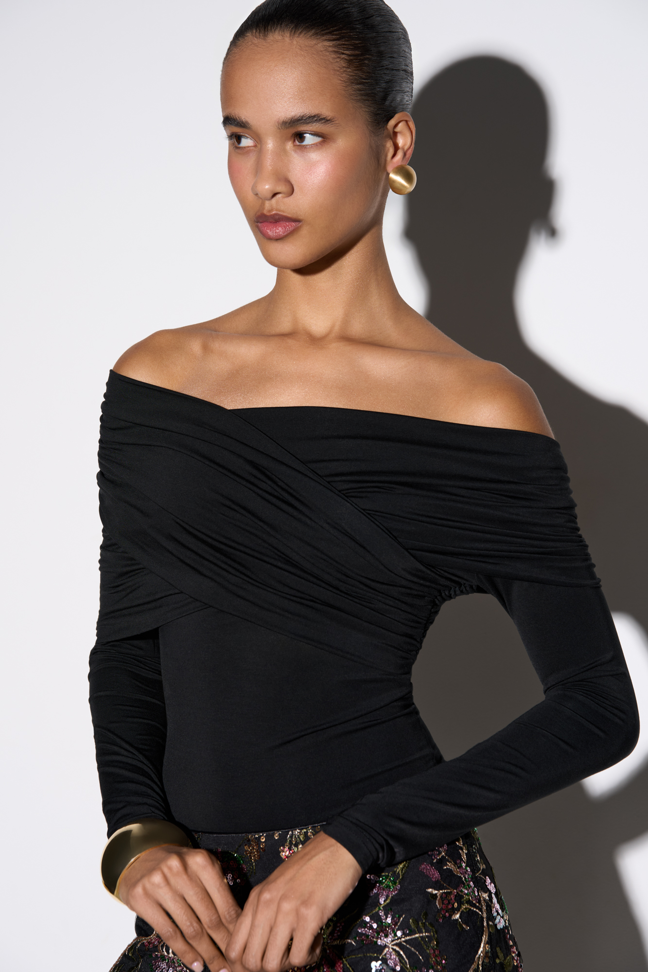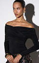 Bodysuit made of soft and silky fabric with draped bodice. Fitted silhouette, long sleeves.