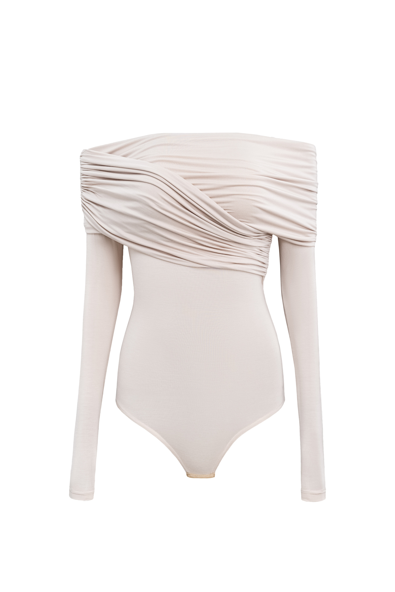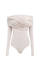Bodysuit made of soft and silky fabric with draped bodice. Fitted silhouette, long sleeves.