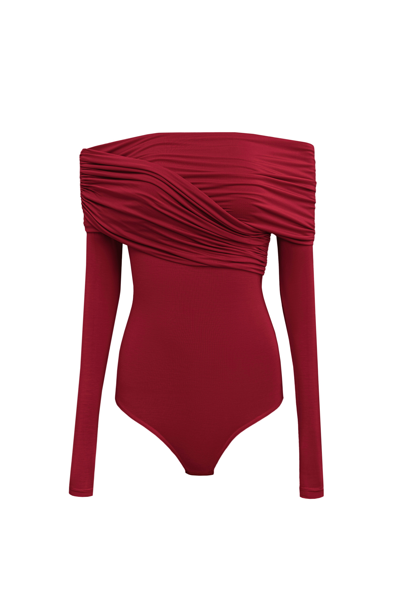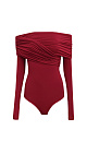Bodysuit made of soft and silky fabric with draped bodice. Fitted silhouette, long sleeves.
