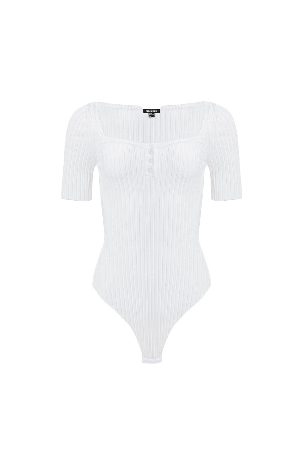 Ribbed knit bodysuit. Features square neckline, short sleeves and hook-and-eye closure.