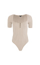Ribbed knit bodysuit. Features square neckline, short sleeves and hook-and-eye closure.