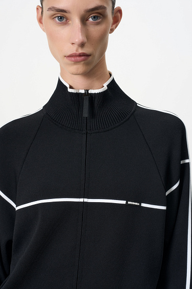 Knit bodysuit with short sleeves. Front zip and round cut on the back.