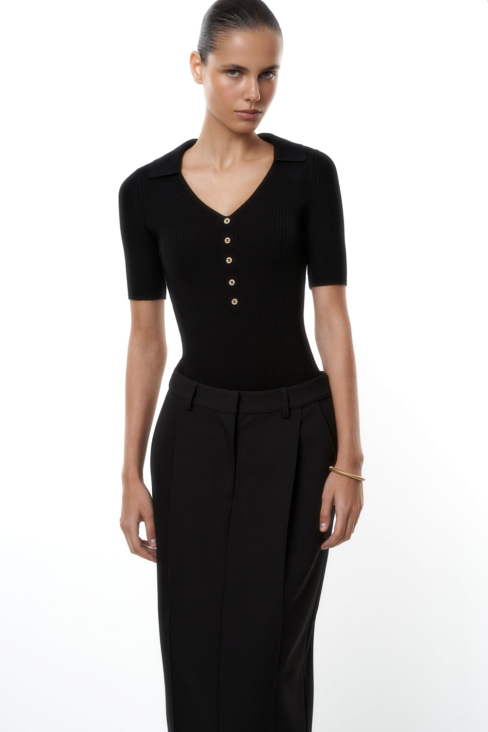 Viscose bodysuit with short sleeves, V-neck and polo collar.