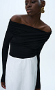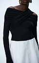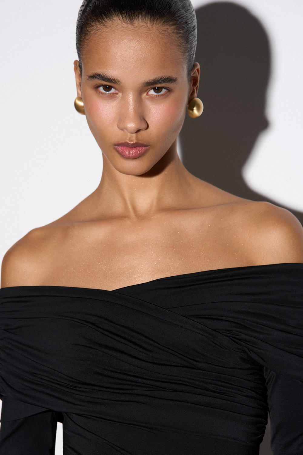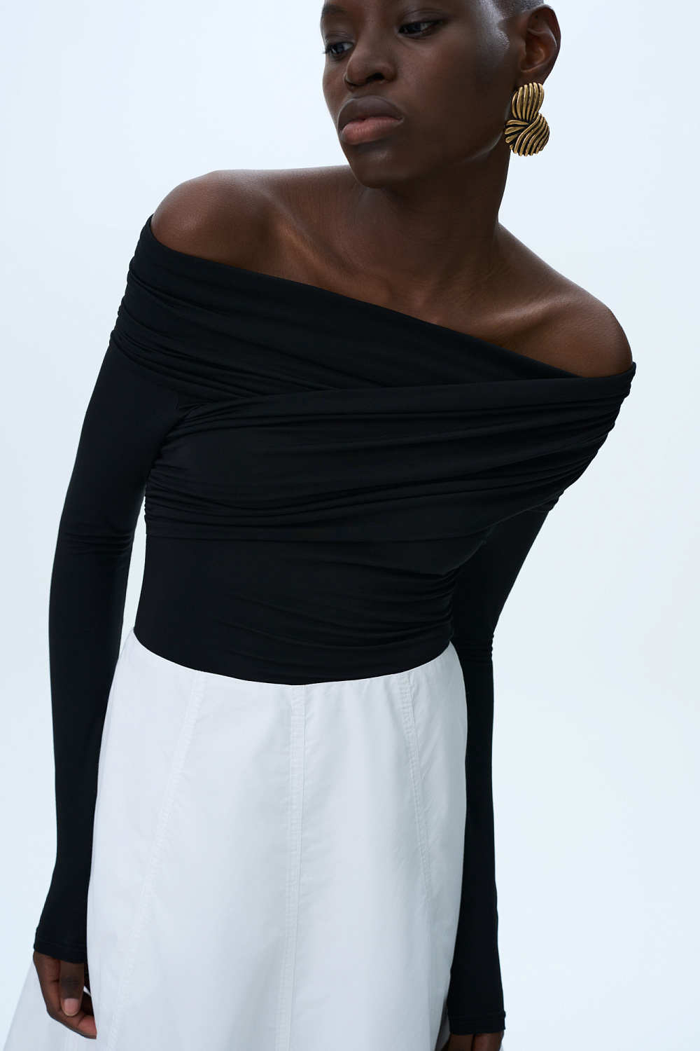 Bodysuit made of soft and silky fabric with draped bodice. Fitted silhouette, long sleeves.