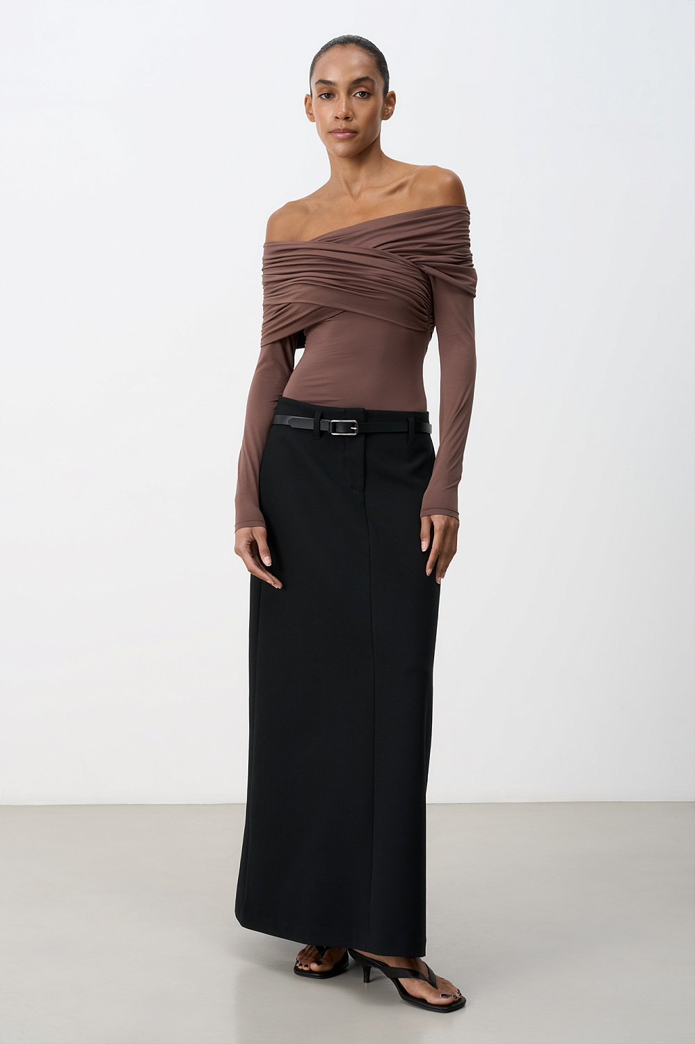 Bodysuit made of soft and silky fabric with draped bodice. Fitted silhouette, long sleeves.