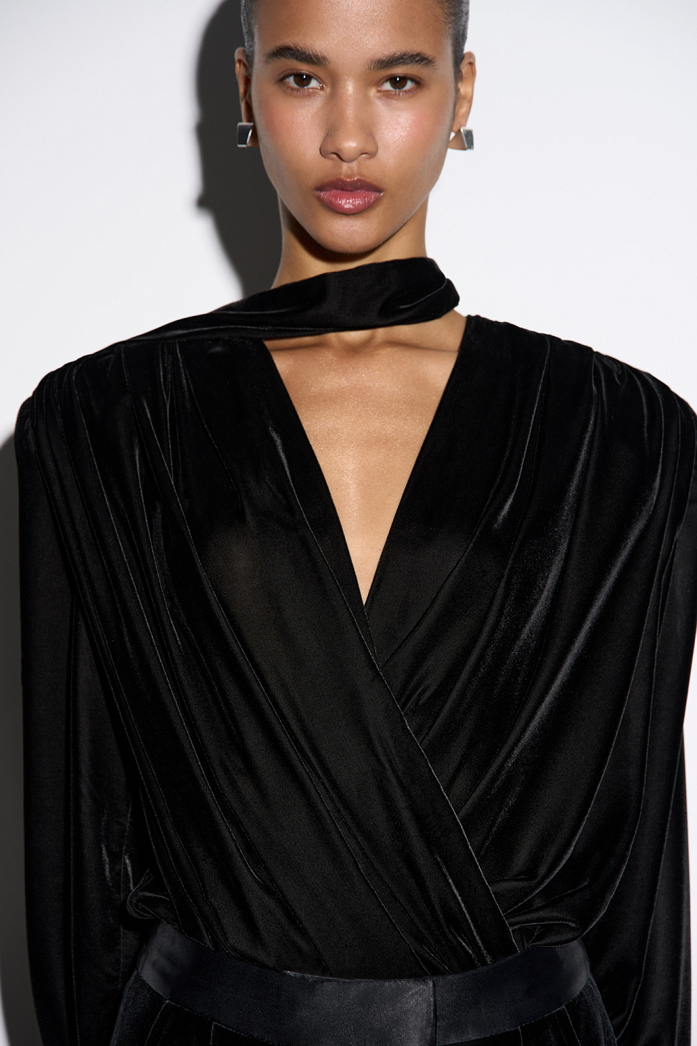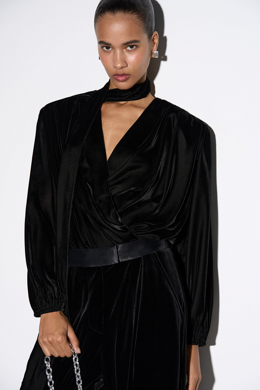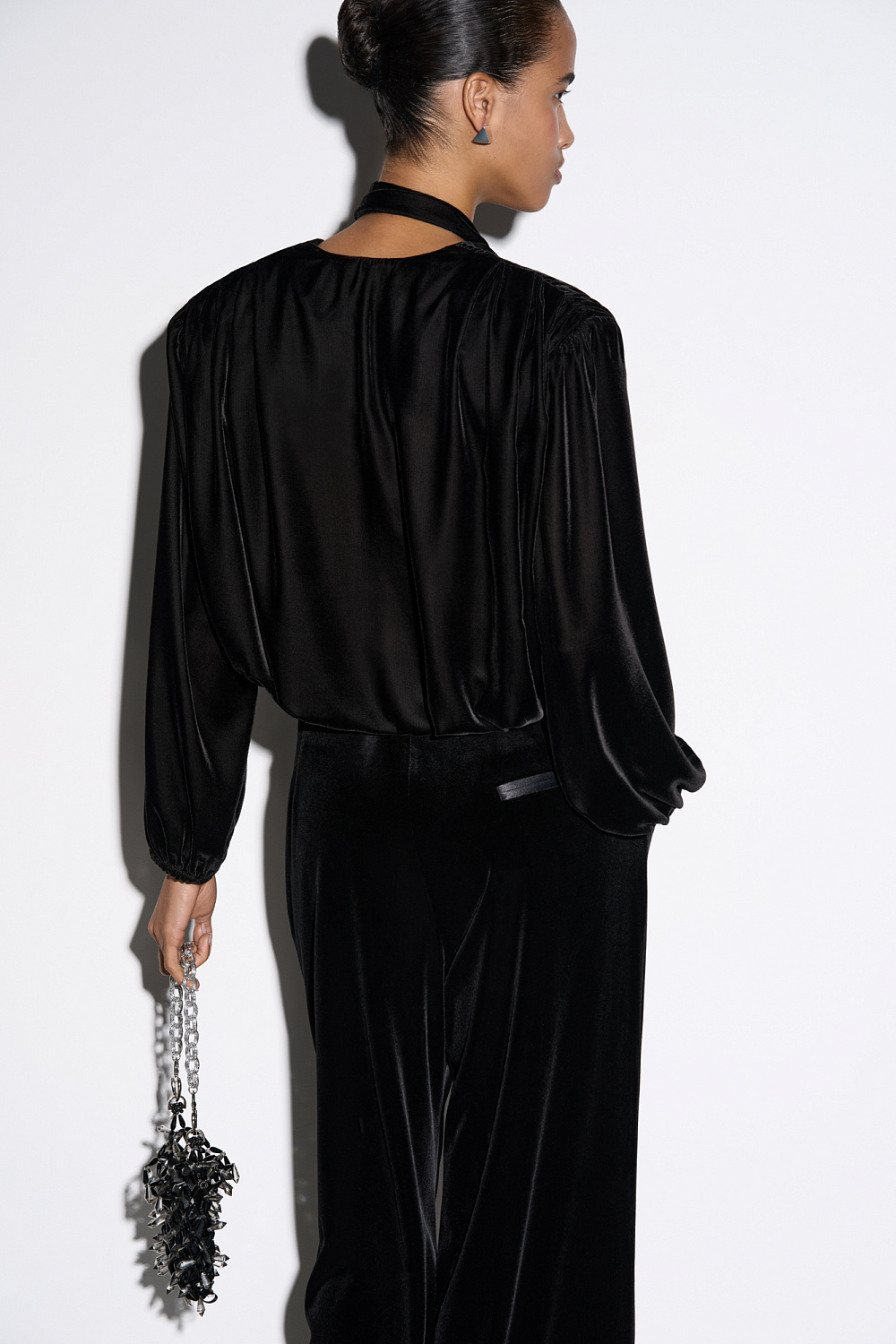 Blouson-body made of velvet fabric. Model with long sleeves, elasticated cuffs, simulated wrap and deep V-neck. Narrow scarf included. Clothes hook closure.