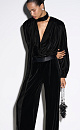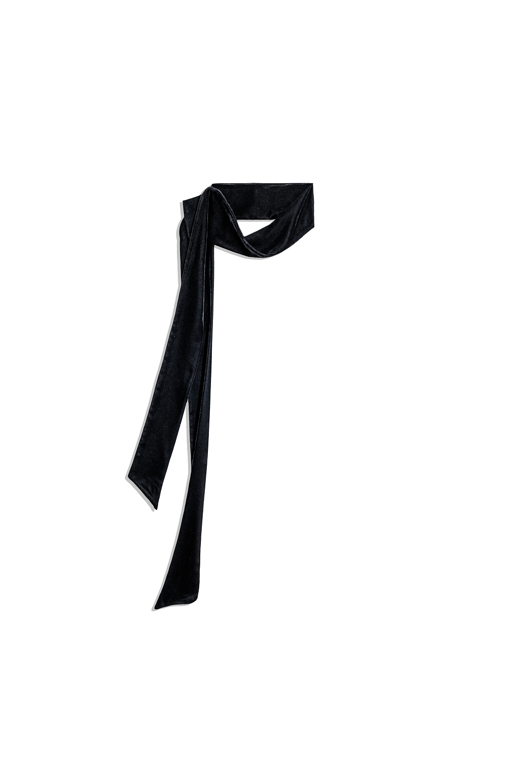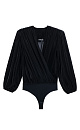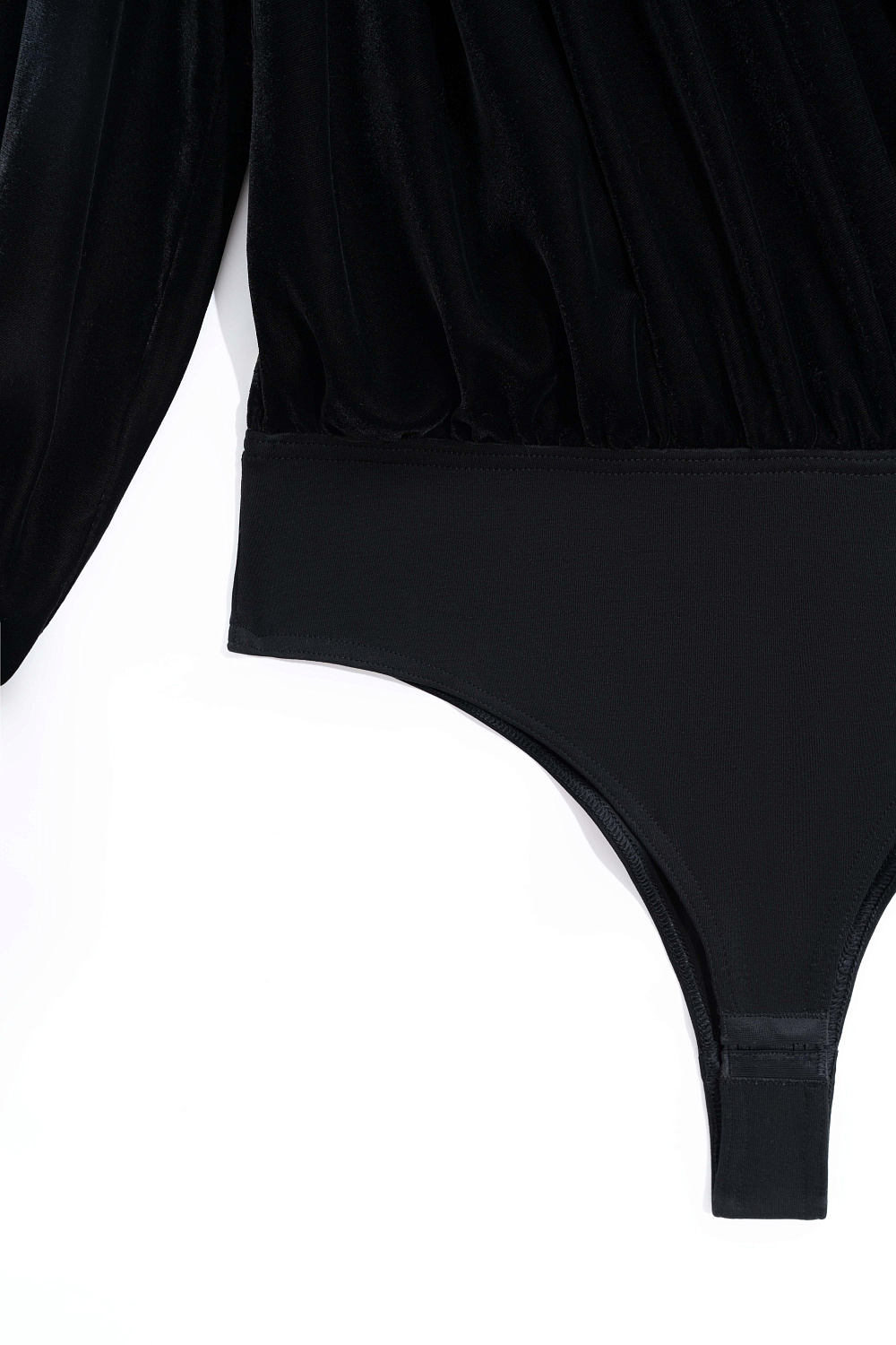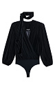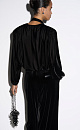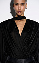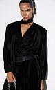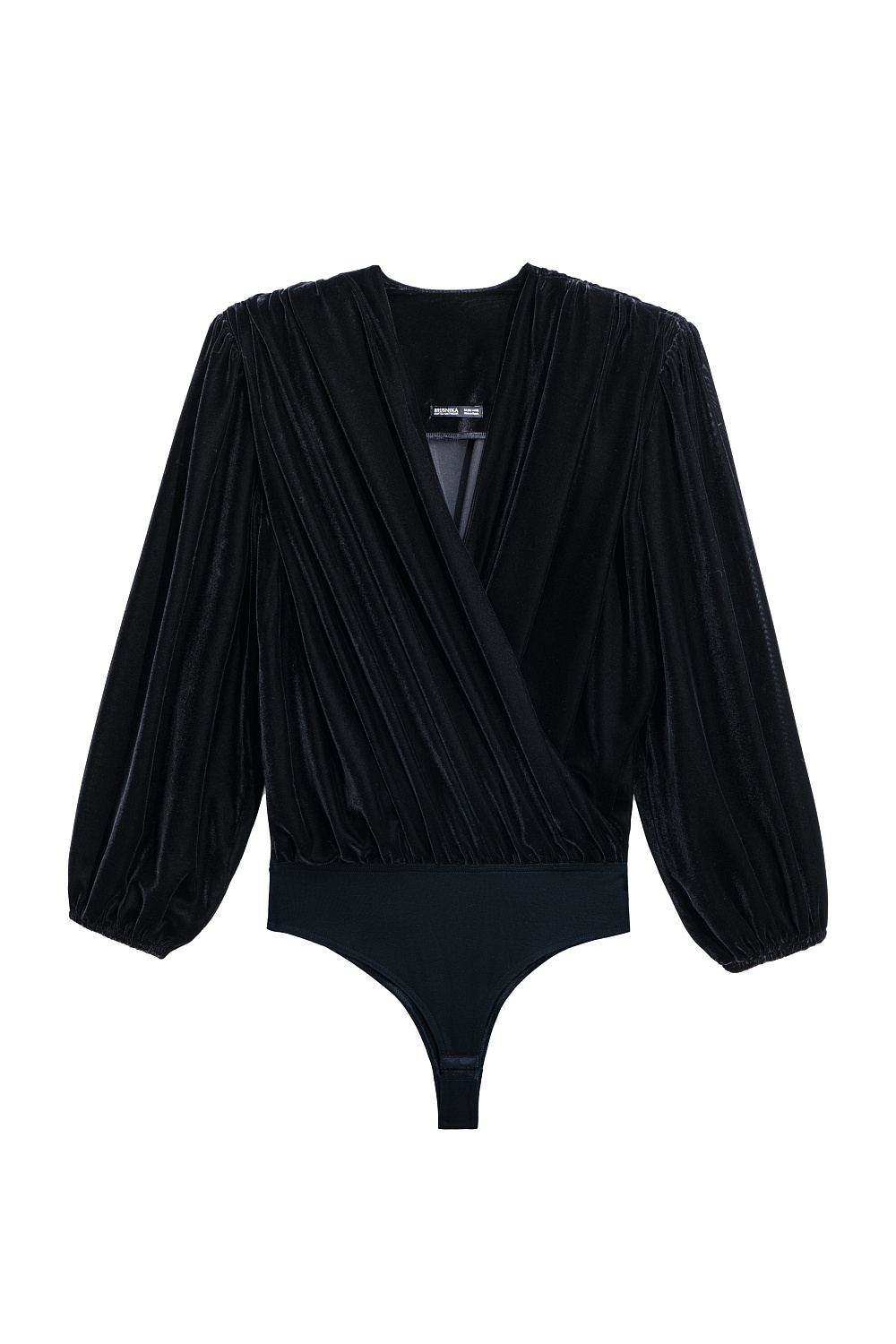 Blouson-body made of velvet fabric. Model with long sleeves, elasticated cuffs, simulated wrap and deep V-neck. Narrow scarf included. Clothes hook closure.