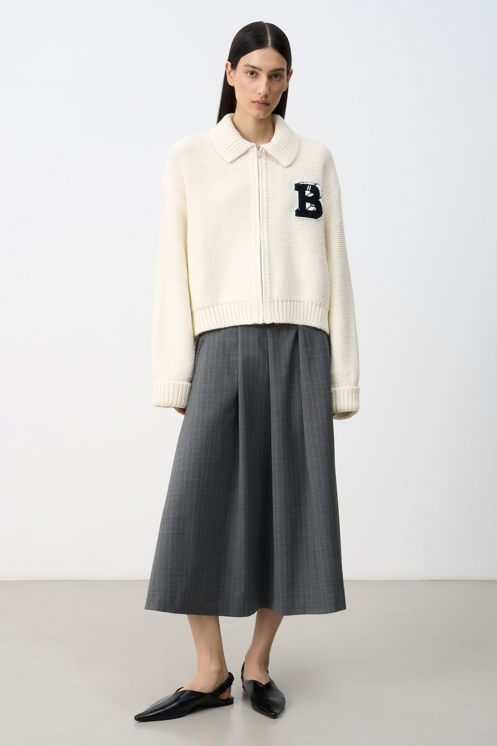Knitted alpaca wool bomber jacket. Relaxed silhouette with a dropped shoulders and logo on the chest. Ribbed edges.