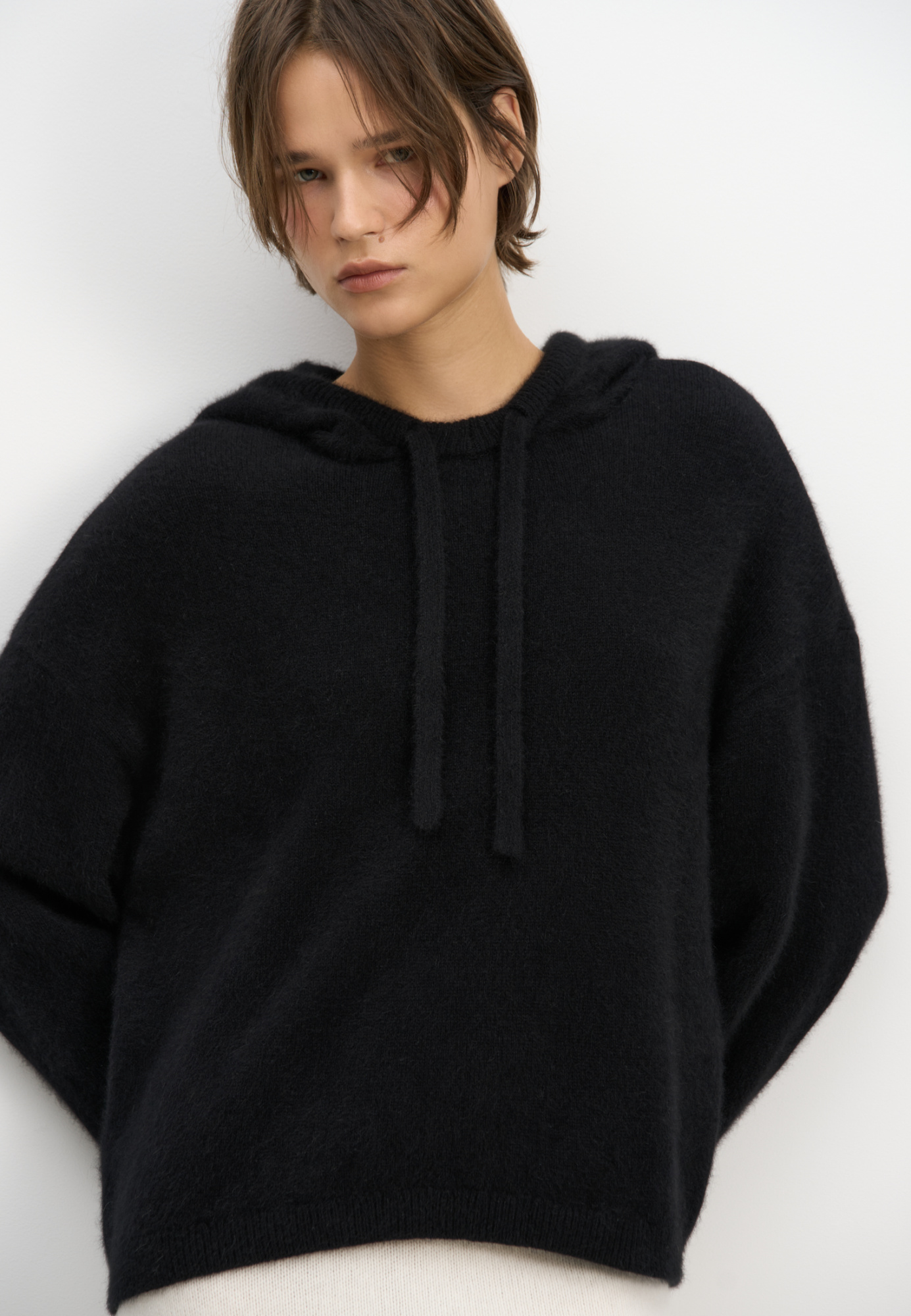 Knitted fox fur hoodie. Loose silhouette model with a hood and dropped shoulders.