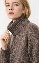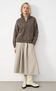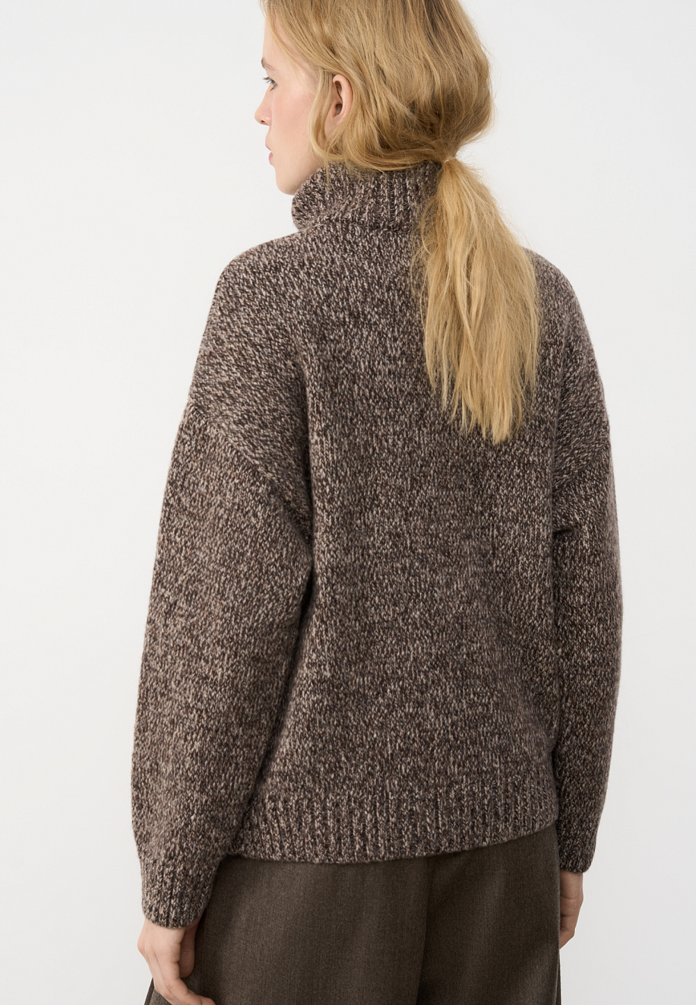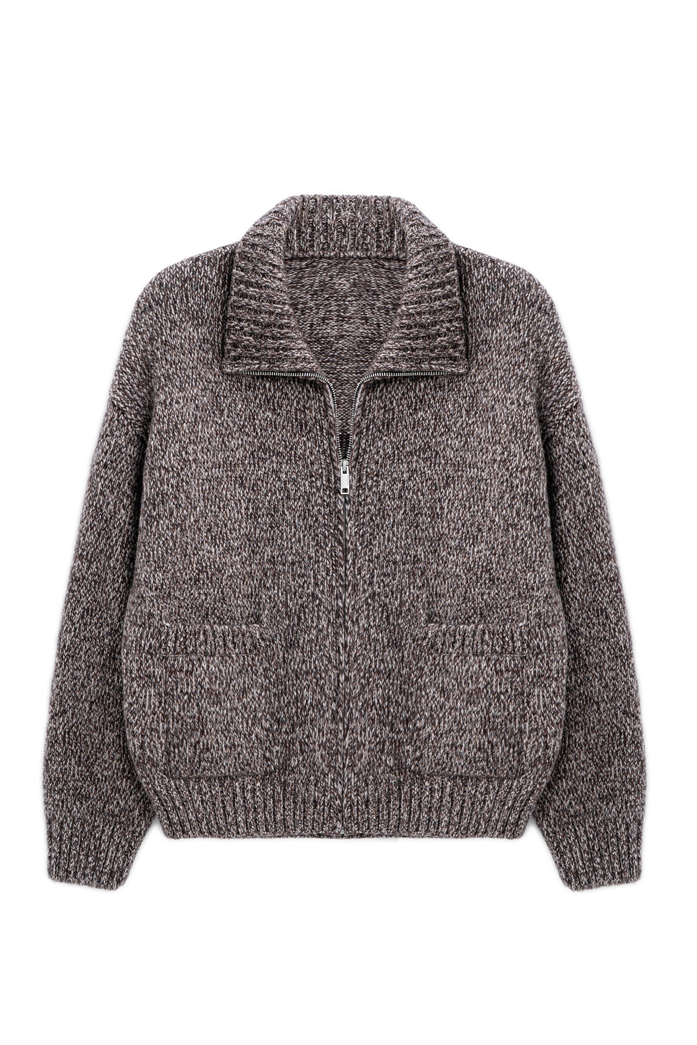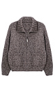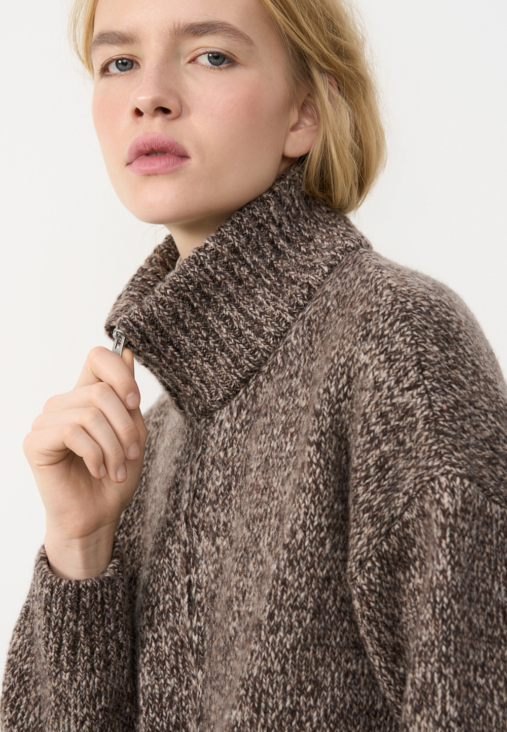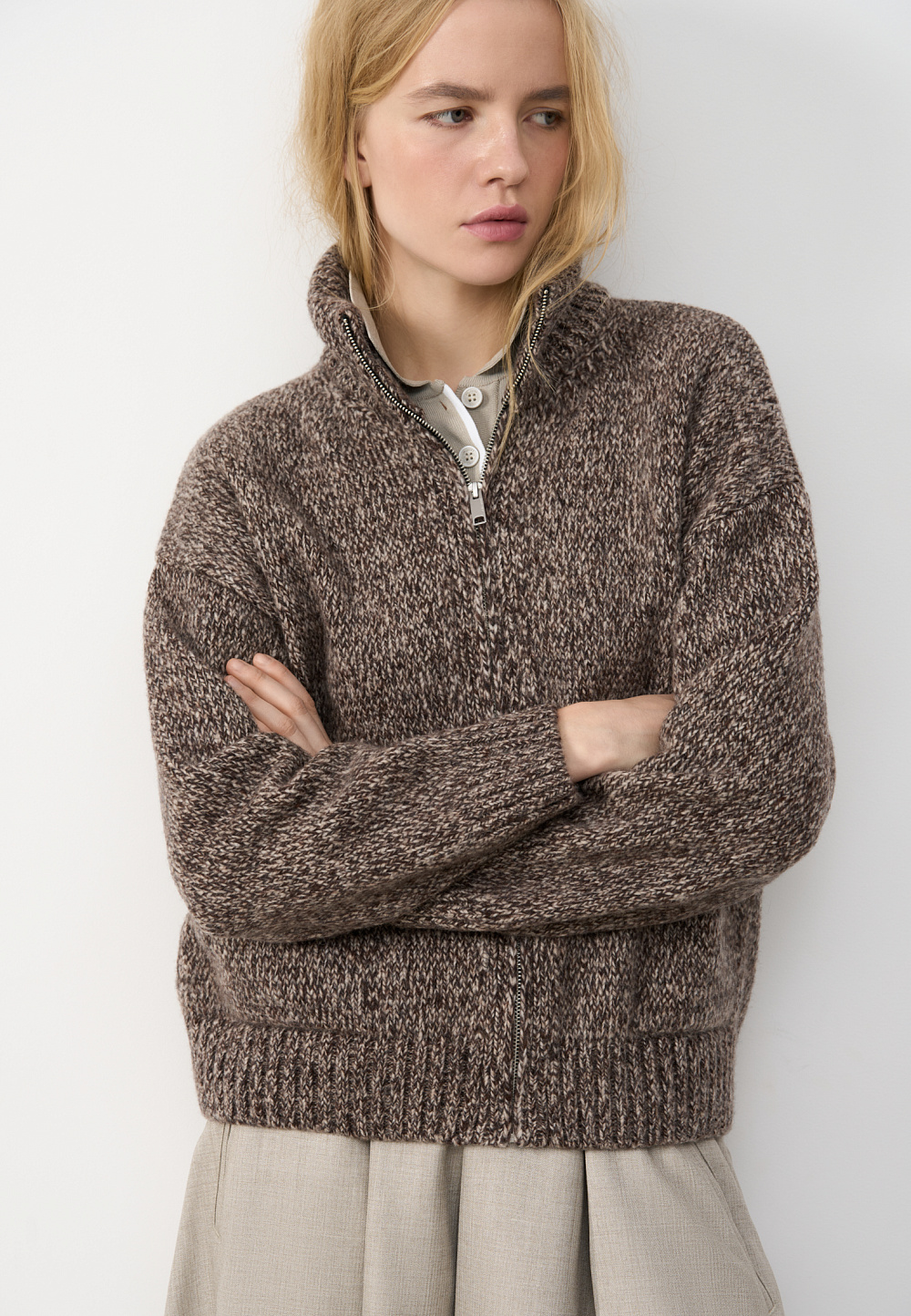 Knitted melange bomber jacket made of extrafine merino wool. The model has a loose silhouette with dropped shoulders, a turn-down collar and two patch pockets. The sleeve cuffs, hem and collar of the product are ribbed.
