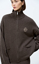 Knitted bomber jacket in a sporty style. Loose silhouette model with dropped shoulders and side pockets. Embroidered brand logo on the chest. Zip closure.