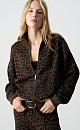 Knitted viscose bomber jacket with animal print imitating leopard spots. The model has a loose fit, with dropped shoulders, a stand-up collar and two side pockets. Zip closure. The edges of the product are ribbed.