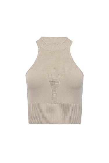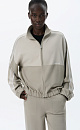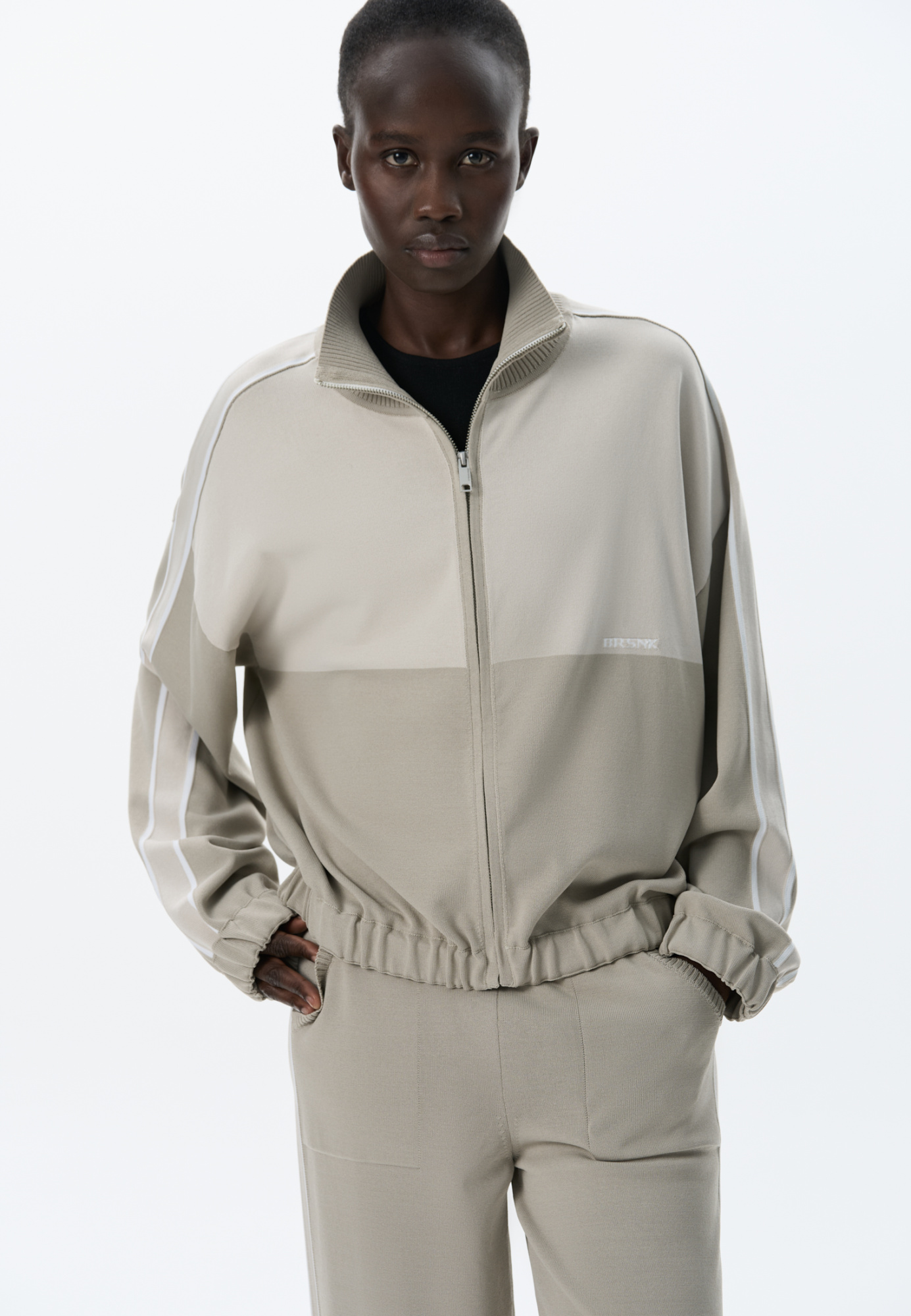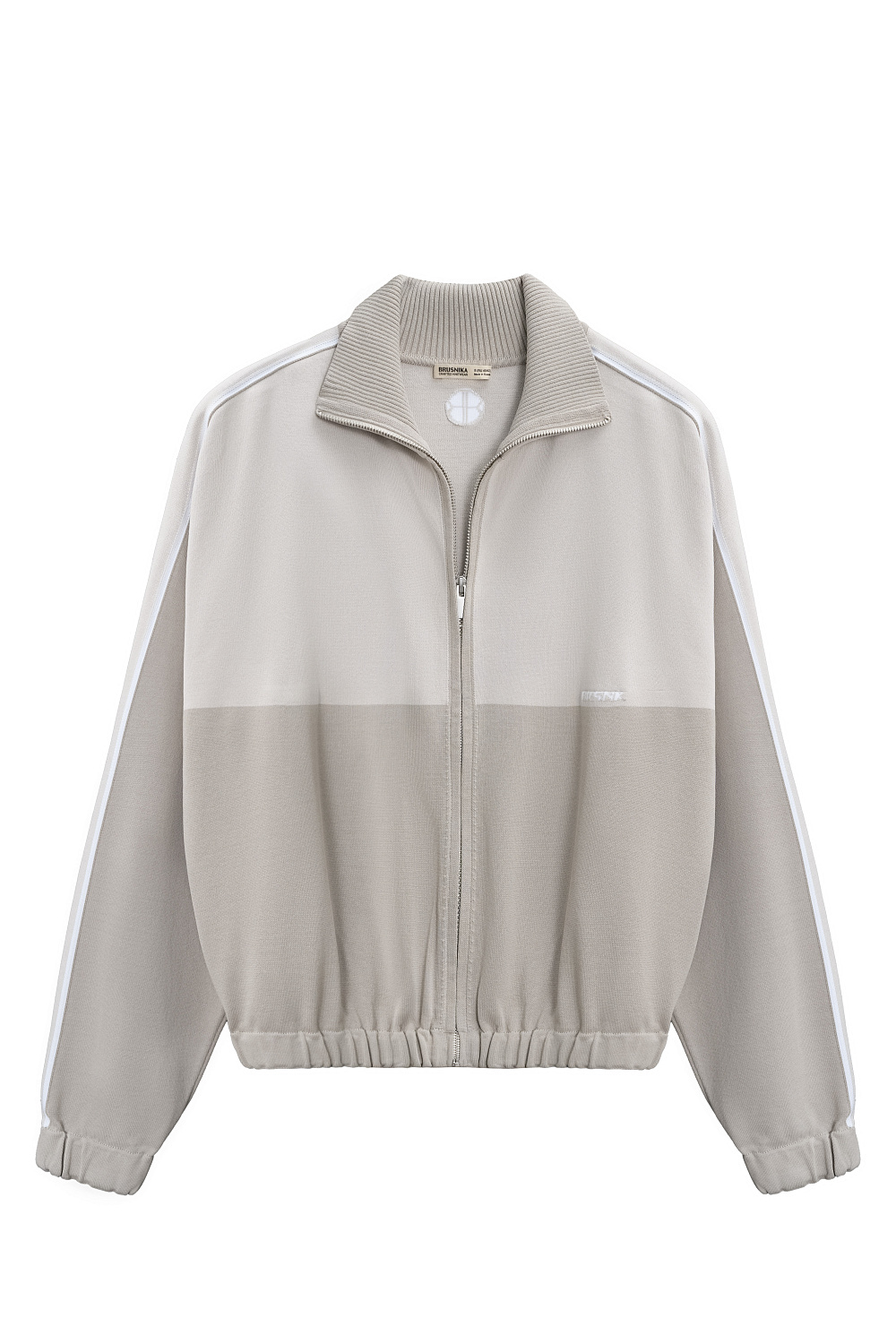 Knitted sports bomber jacket made of viscose. The model has a straight silhouette, with dropped shoulders, long sleeves with wide stripes and a low stand-up collar. The bottom of the product and the cuffs of the sleeves are made with elastic. Zip closure. Branded jacquard on the back.