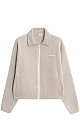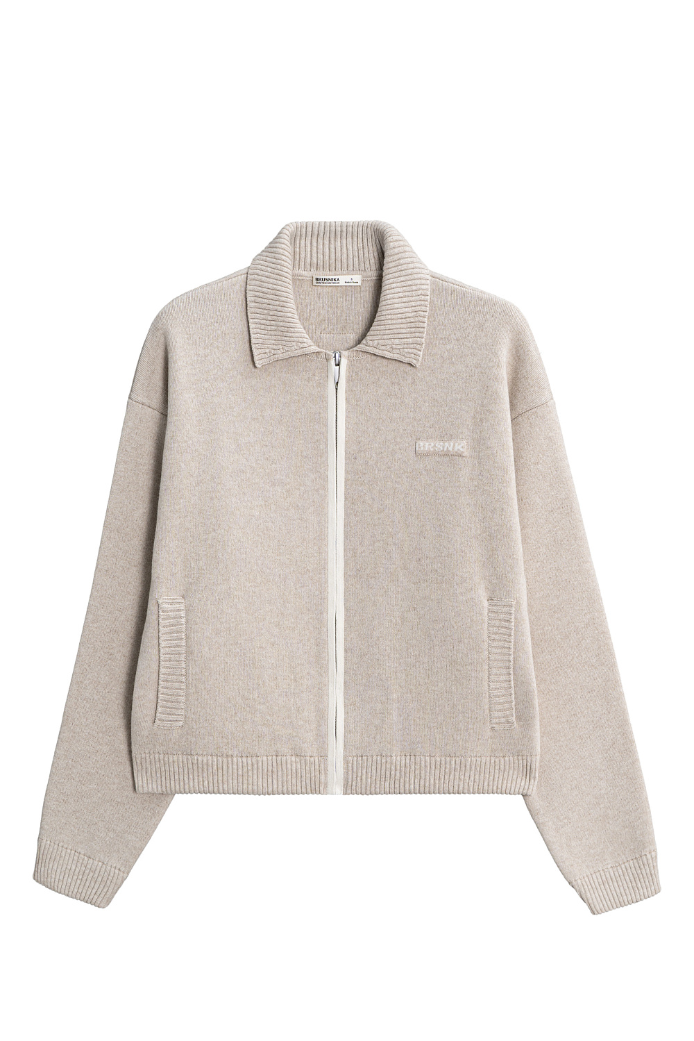 Knitted cashmere and wool bomber jacket. The model has a loose silhouette, with dropped shoulders, a turn-down collar, side pockets, a zipper closure, a contrasting color placket and a branded jacquard on the chest. The bottom of the product is made with elastic. You can complement the look with a skirt in the same style.