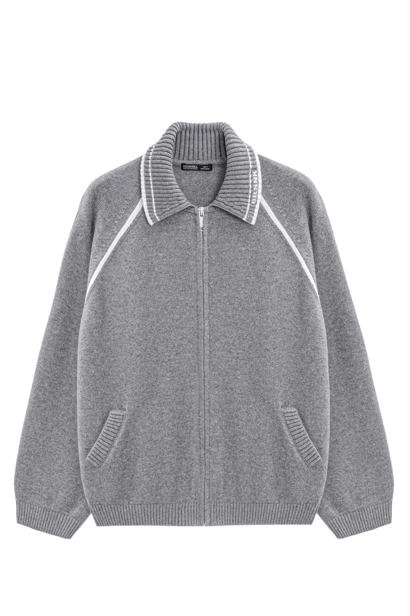 Knitted cashmere and wool bomber jacket. The model has a loose silhouette with raglan sleeves and a turn-down collar, complemented by branded jacquard. Side pockets, zip fastening. The bottom of the product and the cuffs of the sleeves are made of elastic rib.
