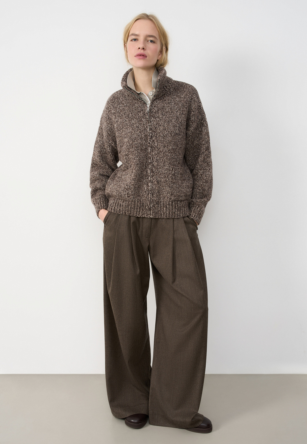 Knitted melange bomber jacket made of extrafine merino wool. The model has a loose silhouette with dropped shoulders, a turn-down collar and two patch pockets. The sleeve cuffs, hem and collar of the product are ribbed.